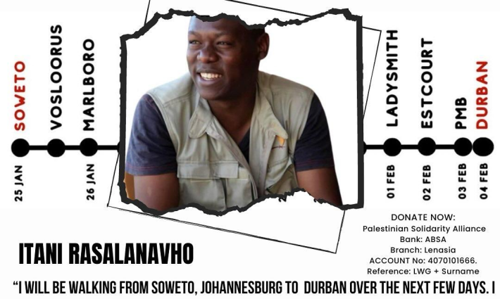 سينطلق الناشط الجنوب أفريقي  عيتاني رازالانفو في مسيرة سيراً على الأقدام من متحف هيكتور بيترسون في منطقة سويتو جنوب أفريقيا الساعة العاشرة صباحاً بتوقيت جنوب أفريقيا وسيتوجه إلى منطقة ديربين وذلك لجمعة التبرعات للمؤسسات الطبيّة في غزة ومن المتوقع أن يصل الناشط نوربين بتاريخ 4 فبراير.