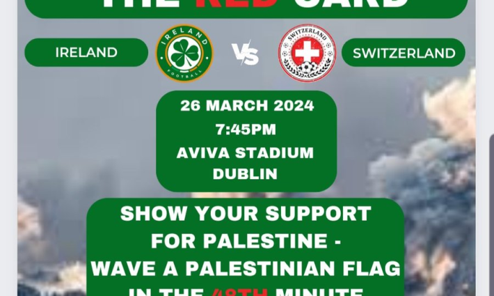 دعت حملة التضامن الأيرلندي الفلسطيني للتلويح بالعلم الفلسطيني في الدقيقة الـ 48 من المبارة بين فريق أيرلندا وسويسرا، لإظهار التضامن مع الشعب الفلسطيني.