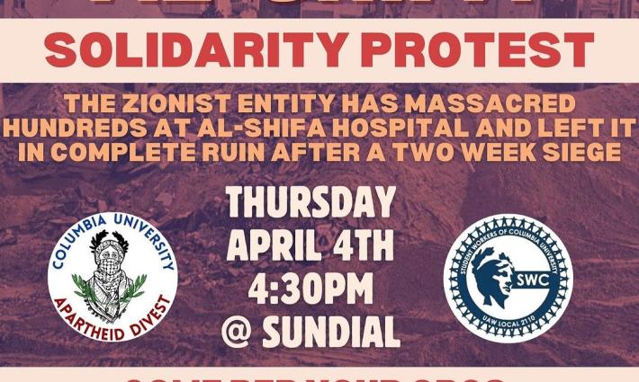 دعت مجموعة طلاب لأجل العدالة في كولومبيا جميع المنظمات الطلابية في الجامعة إلى الحضور لاحتجاج طارئ كتضامن واضح مع شعب فلسطين وما خلفّه الاحتلال من جرائم في مستشفى الشفاء، طالبين منهم حمل لافتات وأعلام فلسطينية.
