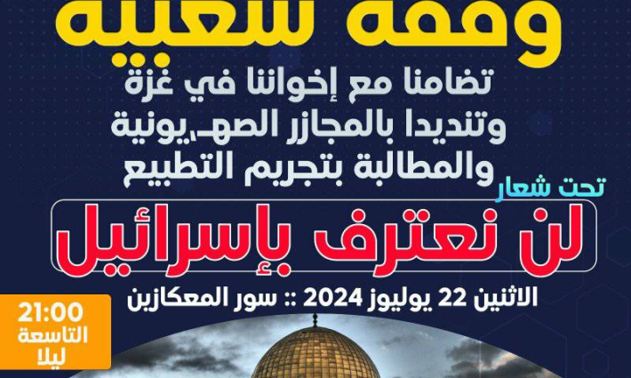 تنظم المبادرة المغربية للدعم والنصرة فرع طنجة وقفة تضامنية مع فلسطين ورافضة للحرب الإسرائيلية على غزة تحت شعار “لن نعترف بإسرائيل” ستطالب بتجريم التطبيع وذلك الساعة التاسعة مساء أمام سور المعكازين.