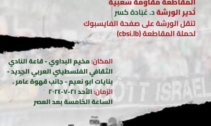 دعت حملة قاطع تقاوم مع حملة مقاطعة داعمي "إسرائيل" في لبنان للمشاركة في ورشة عمل تحت شعار "المقاطعة مقاومة شعبية" وذلك غدًا الأحد في مخيم البداوي للاجئين الفلسطينين الساعة الخامسة عصرًا.