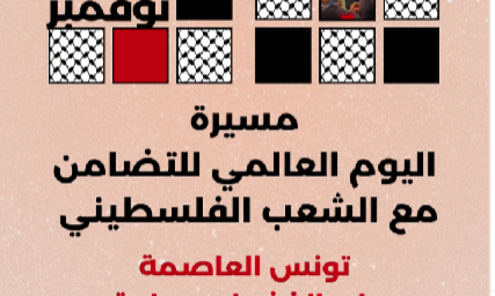 أعلنت مجموعات مؤيدة لفلسطين في تونس عن تنظيم مسيرة تضامنية يوم السبت 30 نوفمبر في الساعة الثالثة مساءً، بمناسبة اليوم العالمي للتضامن مع الشعب الفلسطيني. ستنطلق المسيرة من ساحة باب الخضرة باتجاه شارع الحبيب بورقيبة.