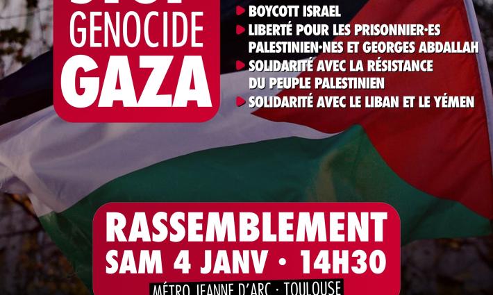 دعت منظمة "رابطة فلسطين ستنتصر" إلى المشاركة في مسيرة تضامنية لإظهار الدعم للشعب الفلسطيني في مدينة تولوز الفرنسية، وذلك بتاريخ 4 يناير 2025، الساعة الثانية والنصف مساءً، في مترو جان دارك .