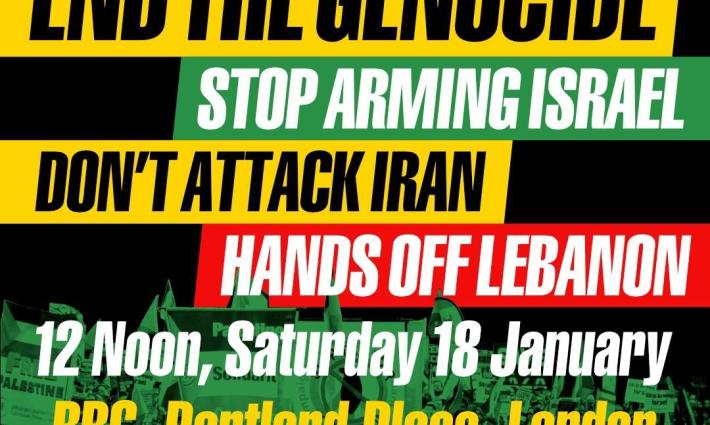 دعت حملة التضامن مع فلسطين في المملكة المتحدة إلى الانضمام في المظاهرة الوطنية القادمة بتاريخ 18 يناير 2025 في بورتلاند بليس بلندن، للتضامن مع فلسطين، والمطالبة بإنهاء تواطؤ الحكومة البريطانية في الإبادة الجماعية المستمرة التي يرتكبها كيان الاحتلال الإسرائيلي.