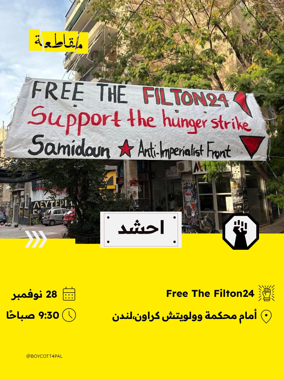 دعت مجموعة “Free The Filton24” المتضامنين مع فلسطين والنشطاء للمشاركة في وقفات أسبوعية أمام محكمة وولويتش كراون، 2 شارع بيلمارش، لندن SE28 0EY، من الساعة 9:30 صباحًا حتى 4:30 مساءً، بدءًا من 28 نوفمبر، تضامنًا مع 6 من نشطاء حركة “فيلتون 24” الذين يخضعون للمحاكمة.