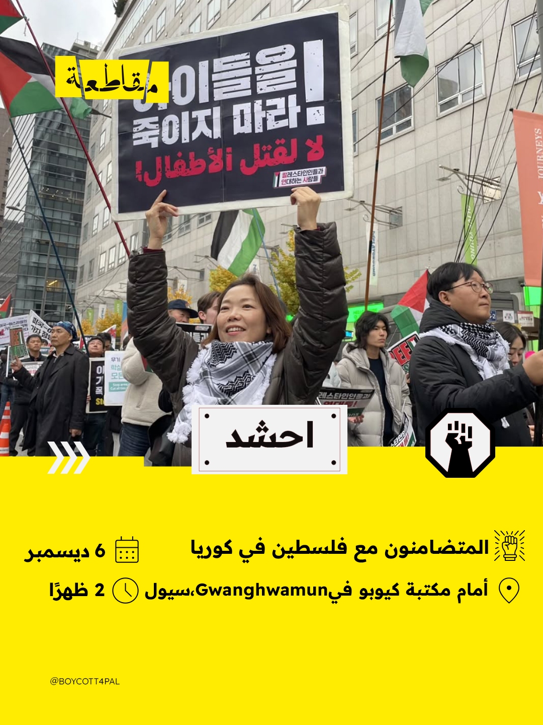 أعلنت مجموعة "المتضامنون مع فلسطين في كوريا" عن تنظيم وقفة تضامنية أمام مكتبة كيوبو في منطقة Gwanghwamun بمدينة سيول، يوم السبت 6 ديسمبر، في تمام الساعة 2 ظهرًا، إحياءً للذكرى التاريخية للانتفاضة الفلسطينية الأولى عام 1987.