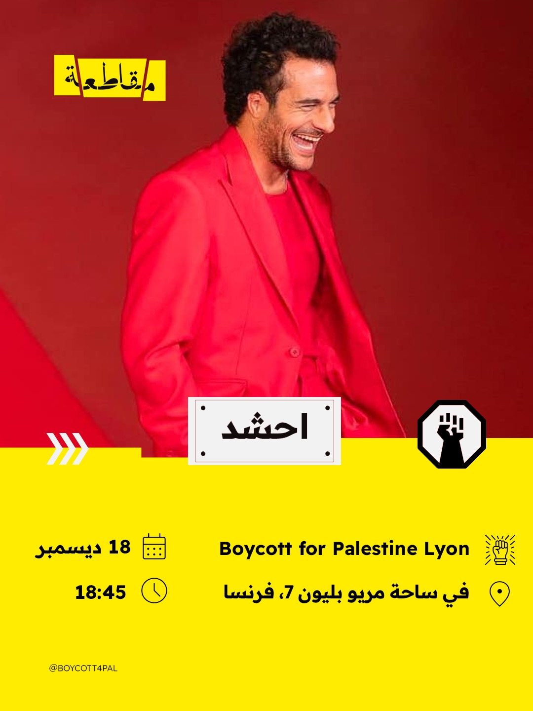 دعت حركة Boycott for Palestine Lyon إلى تجمع احتجاجي يوم الخميس 18 ديسمبر الساعة 18:45 في ساحة مريو بليون 7، رفضًا لإقامة حفل الفنان الإسرائيلي أمير، مؤكدين أنه “شريك في الإبادة الجماعية”.