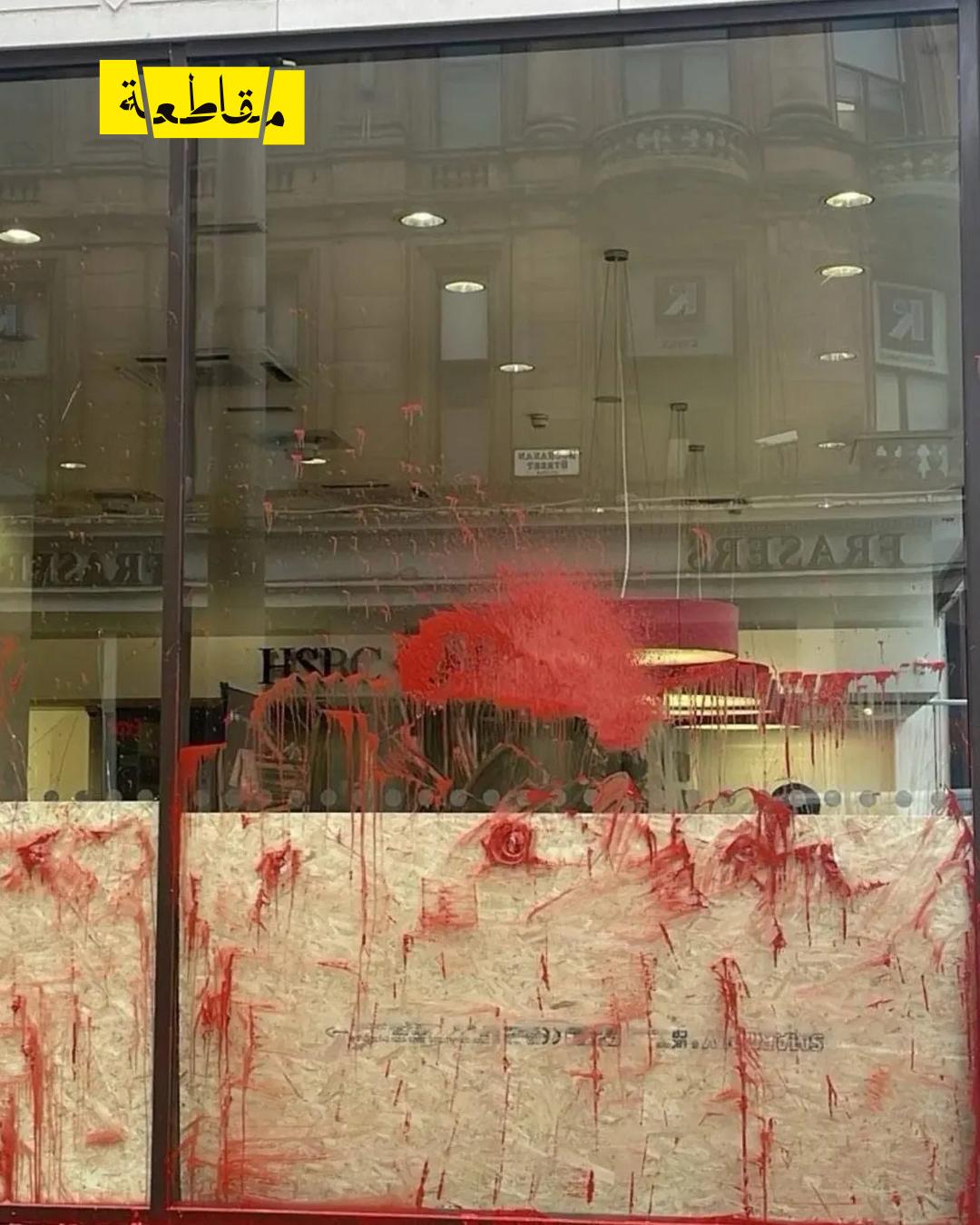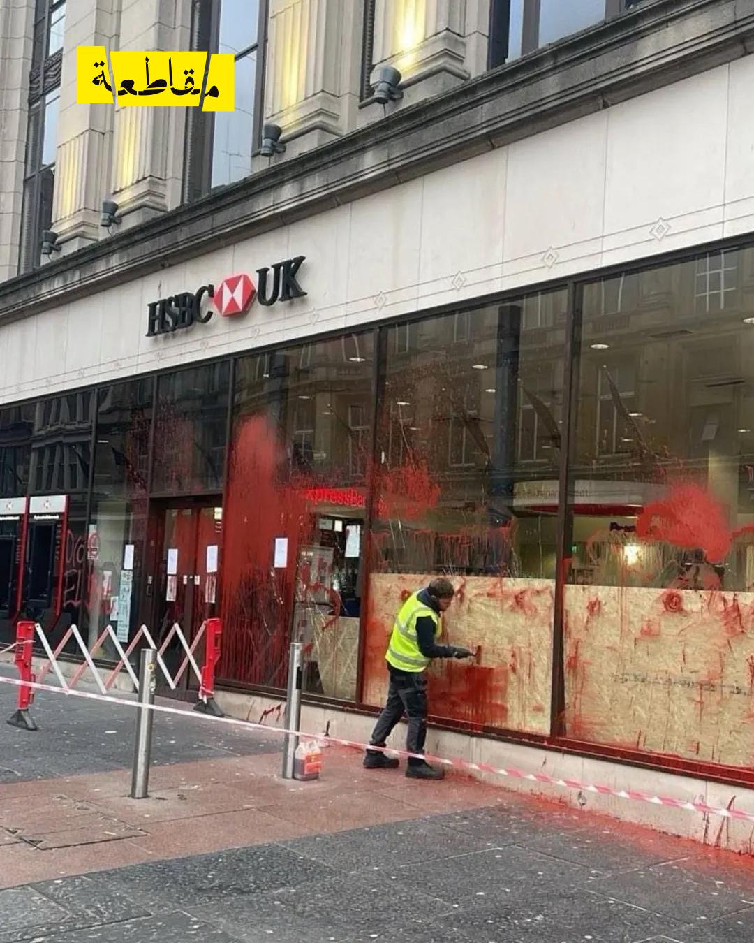 تعرض فرع بنك HSBC في غلاسكو - أسكتلندا، مجددًا لاستهداف احتجاجي من قبل نشطاء من مجموعة The After Shock، ما اضطر البنك إلى إغلاق فرعه مؤقتًا.