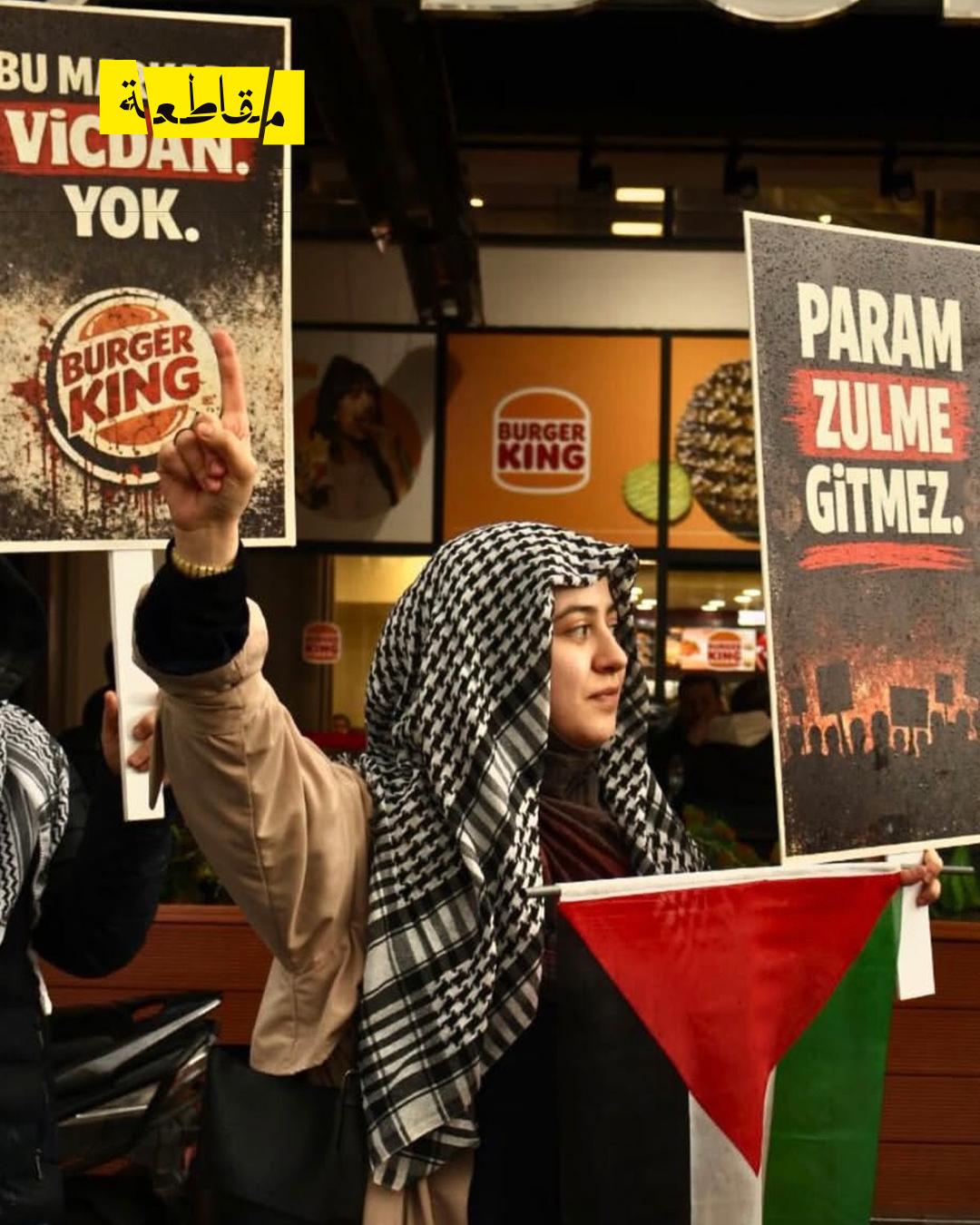 احتجّ نشطاء من حركة Bursa Boykot Rehberi، المعروفون باسم “حُراس المقاطعة”، أمام أحد فروع سلسلة الوجبات السريعة "برغر كينغ" في مدينة بورصة التركية، مطالبين بمقاطعة المطعم لتواطئه مع الاحتلال في ظل حرب الإبادة المستمرة بحق الفلسطينيين في غزة.