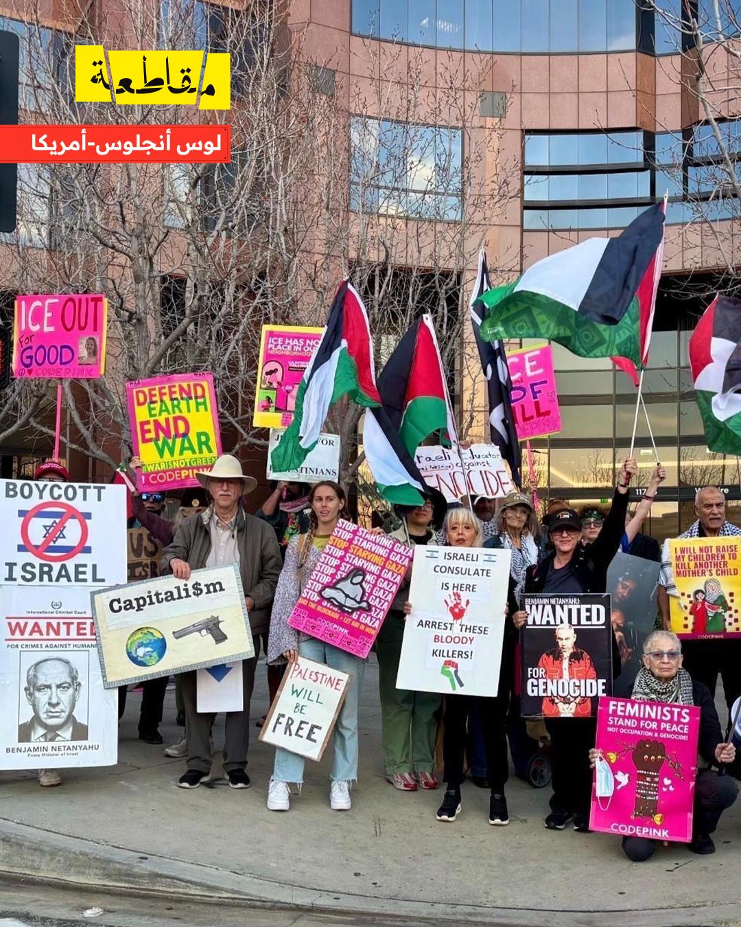 وفي الولايات المتحدة، نظم نشطاء من "كود بينك" اعتصامًا أمام السفارة الإسرائيلية في لوس أنجلوس، مؤكدين استمرار الضغط الشعبي على المؤسسات الأمريكية للحفاظ على التزامها بالقانون الدولي وحقوق الإنسان. ورفع المشاركون شعارات تطالب بالعدالة للفلسطينيين وإيقاف الدعم المباشر وغير المباشر للاحتلال الإسرائيلي.