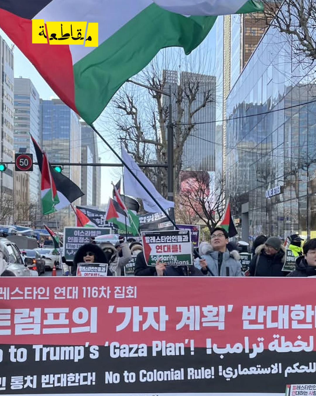 تظاهر عشرات النشطاء المتضامنين مع فلسطين من مجموعة “فلسطين حرة” في مدينة سيول بكوريا الجنوبية، في فعالية حاشدة أمام مكتبة كيوبو في غوانغهوامون. ورفض المشاركون ما أسموه “لجنة سلام غزة” التي أطلقها الرئيس الأمريكي دونالد ترامب، مشيرين إلى أنها منظمة استعمارية وتهدف إلى النهب والتطهير العرقي، ودعوا الحكومة الكورية إلى عدم المشاركة فيها.