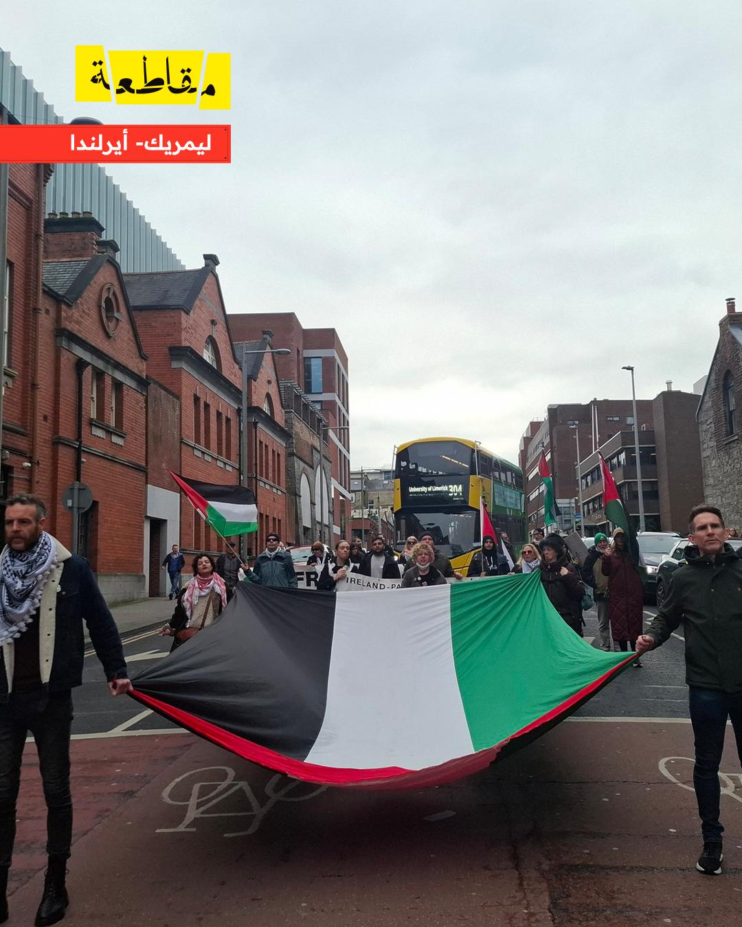 أما في مدينة ليمريك بأيرلندا، فقد شهدت الساحة الرئيسية تجمعًا جماهيريًا واسعًا، حيث وزّع المشاركون نشرات توضح دور الاحتلال في القمع والتمييز ضد الفلسطينيين، داعين إلى مقاطعة أي فعاليات رياضية أو ثقافية يشارك فيها الاحتلال.