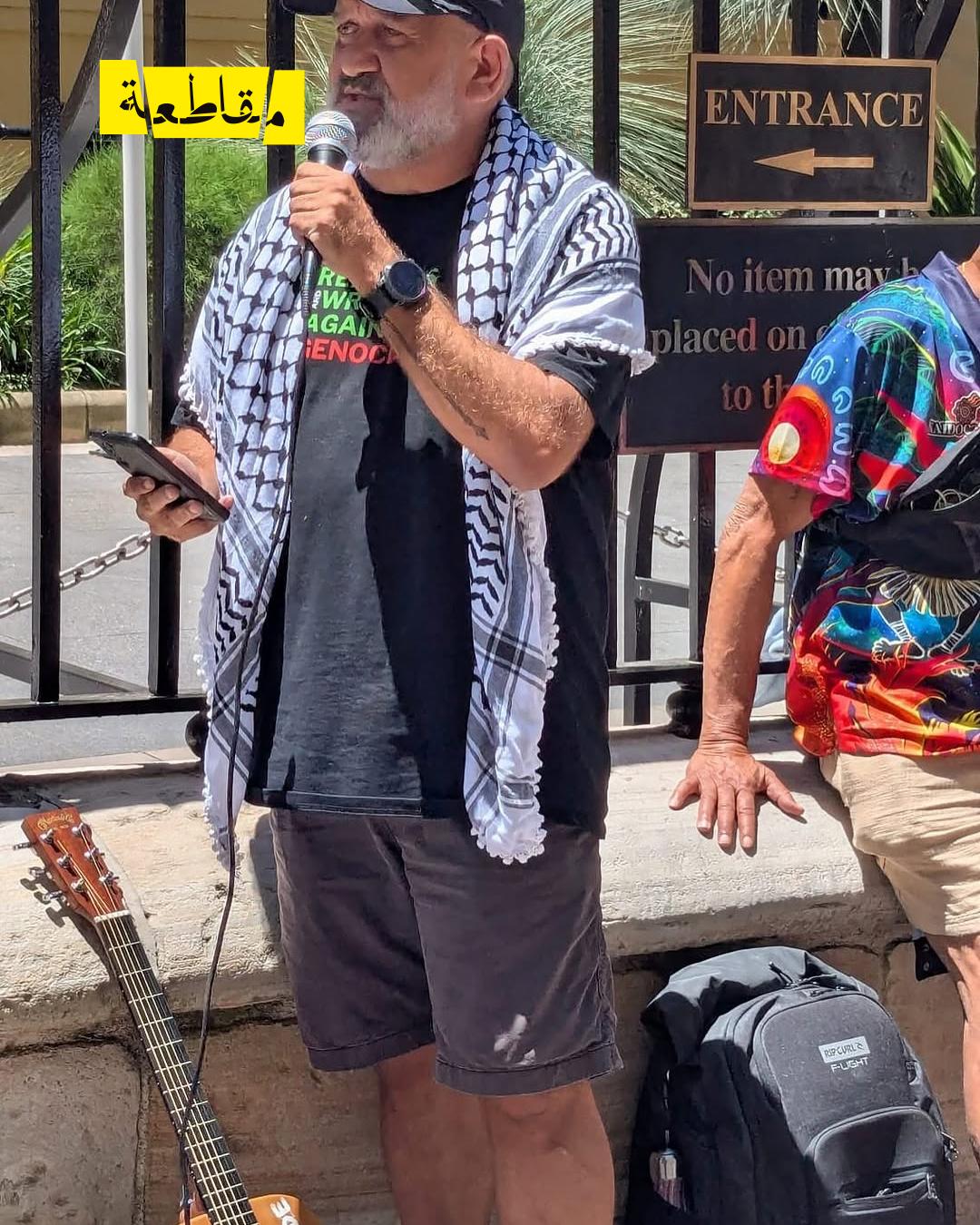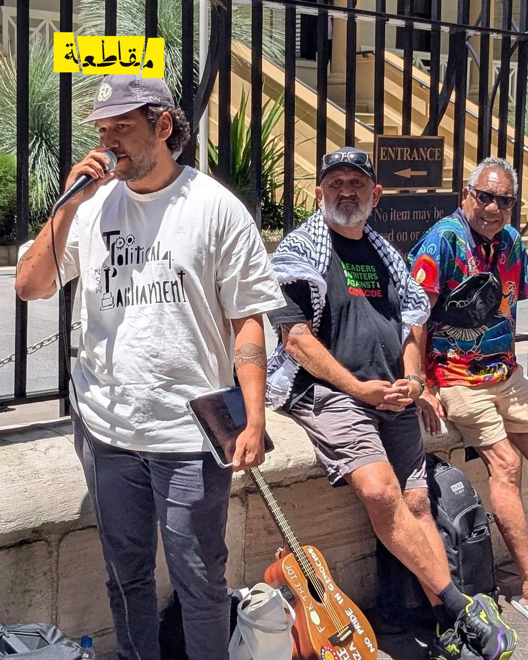 تجمّع مئات المتظاهرين أمس في 27 نوفمبر/تشرين الثاني أمام برلمان نيو ساوث ويلز دعمًا لجايدن كيتشنر‑ووترز،العازف الذي يخضع للتحقيق بعد منعه من العزف داخل البرلمان بسبب غيتار حمل شعارات مناهضة للإبادة مثل "لا فخر بالإبادة الجماعية" و"حرروا غزة".