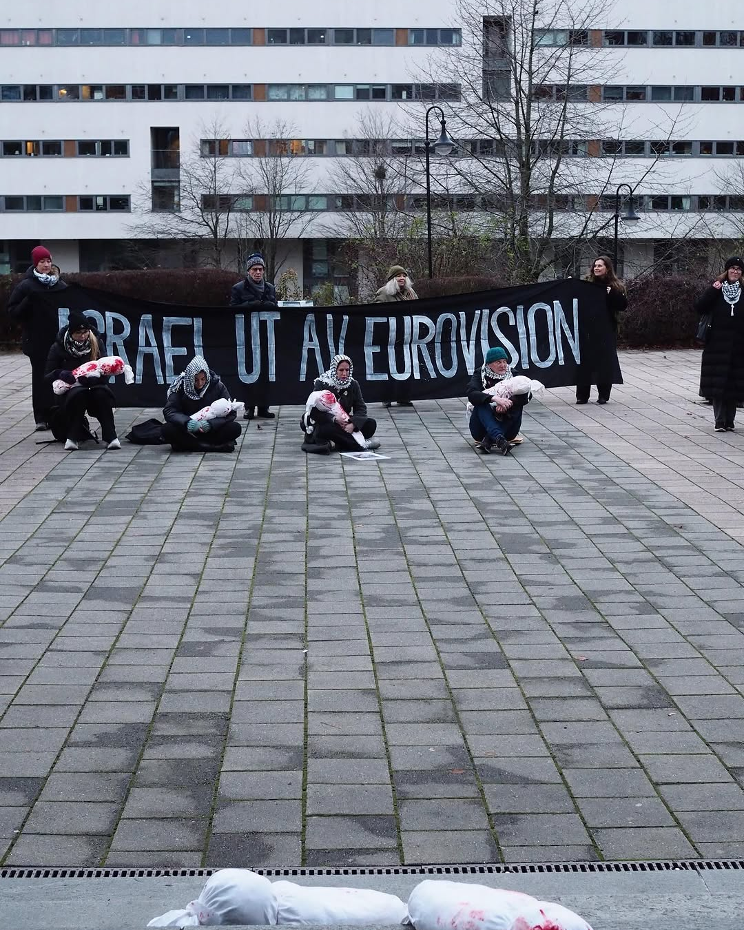 ورفع المتظاهرون الأعلام الفلسطينية مردّدين شعار "كفى يا NRK!"، تنديدًا بتغطيتها للمسابقة، معتبرين أن السماح للاحتلال بالمشاركة يمثّل تطبيعًا لجرائم الحرب في مسابقة غنائية دولية.