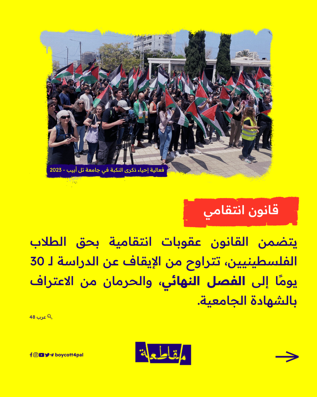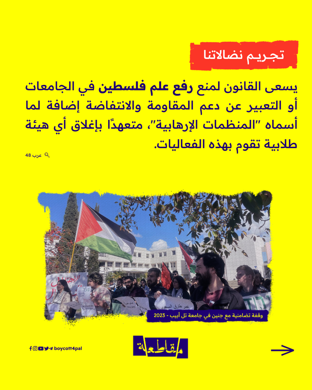 في سعيه لكسر إرادة الشباب الفلسطينيين في الداخل المحتل، وعرقلة الحراك الوطني المتصاعد، شرّع الاحتلال قانونًا بتضمن عقوبات جنونية لتجريم مظاهر ارتباط الطلبة بهويتهم وقضية شعبهم، وإعلان الحرب على الحركة الطلابية في الجامعات الإسرائيلية.