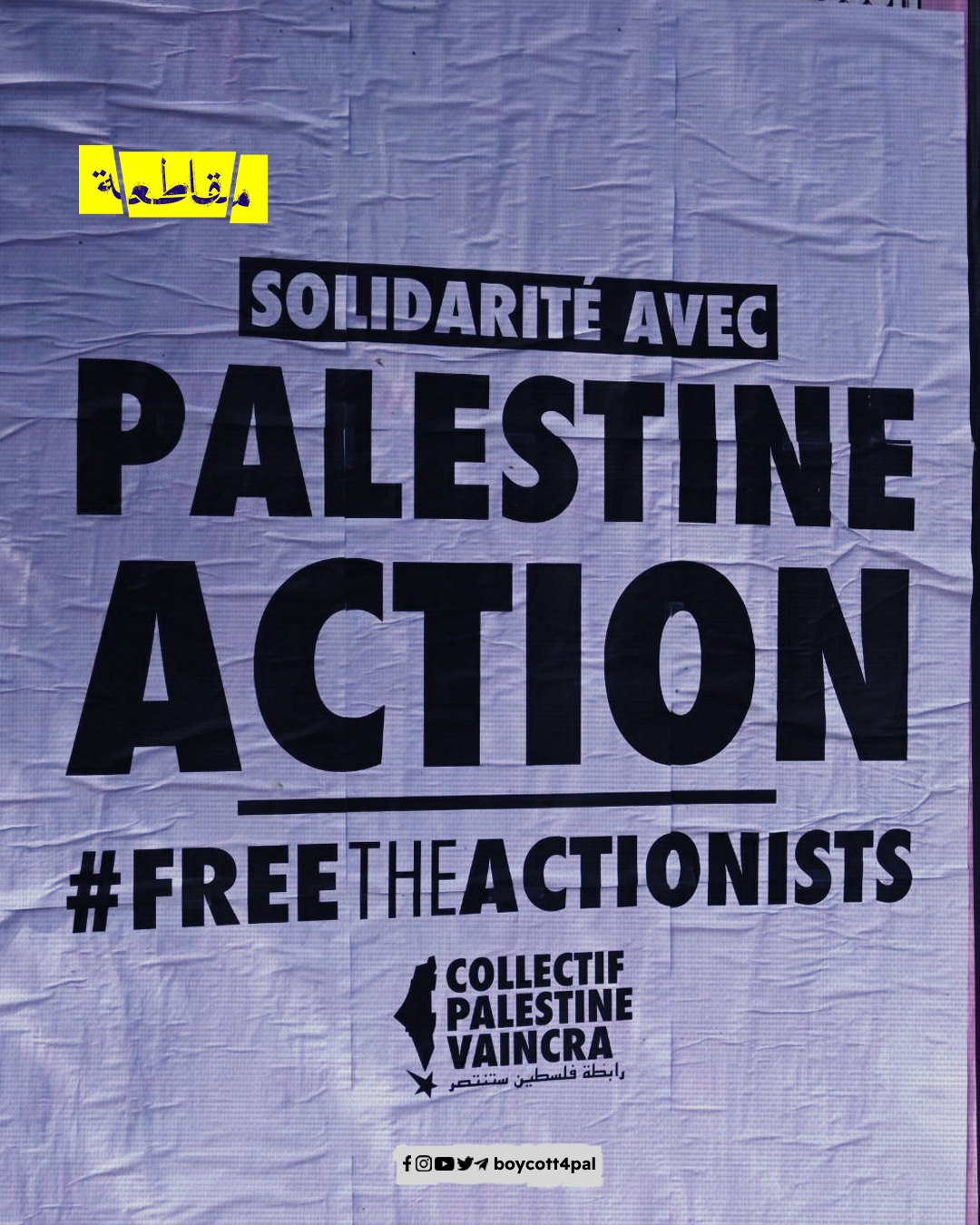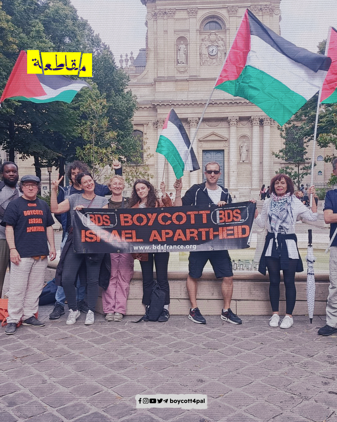 تظاهر نشطاء حركة المقاطعة وعدد من المناصرين للقضية الفلسطينية في العاصمة الفرنسية باريس رفضًا لمشاركة فريق الاحتلال في طواف فرنسا، رافعين الأعلام الفلسطينية رغم منع الشرطة الفرنسية لذلك.