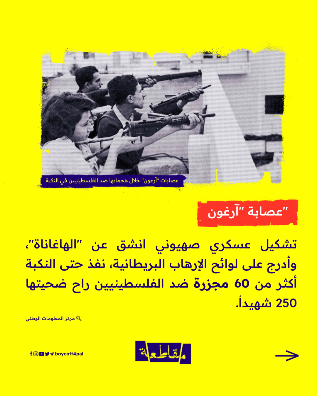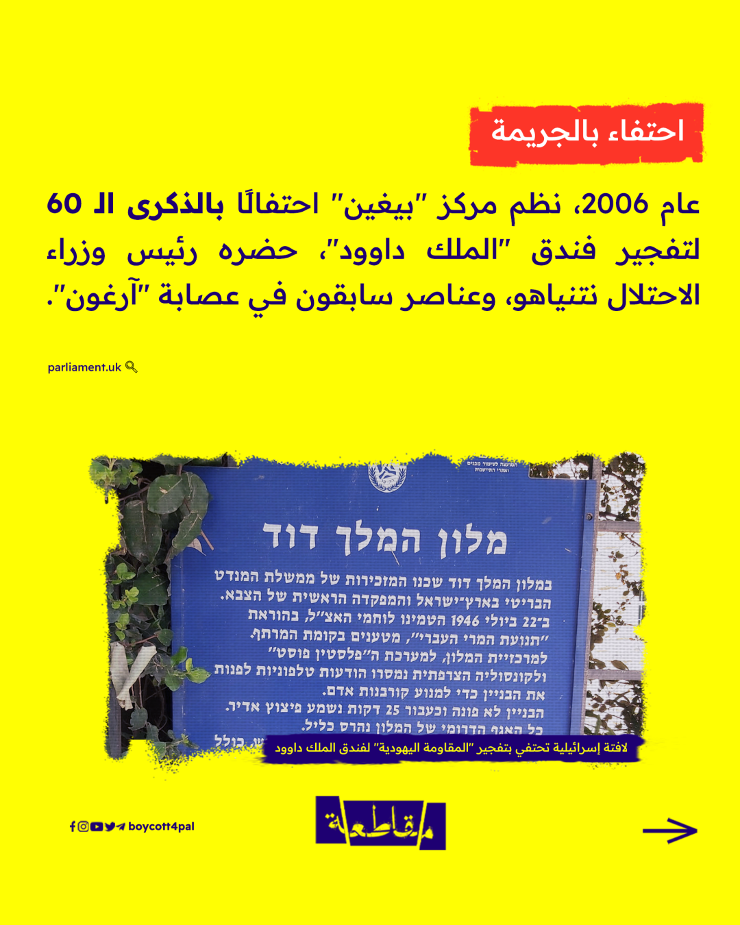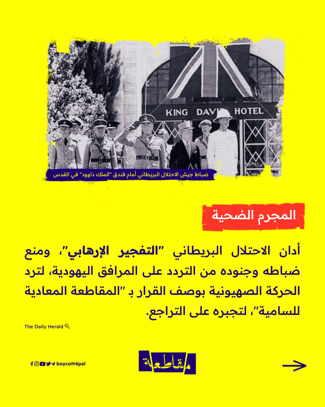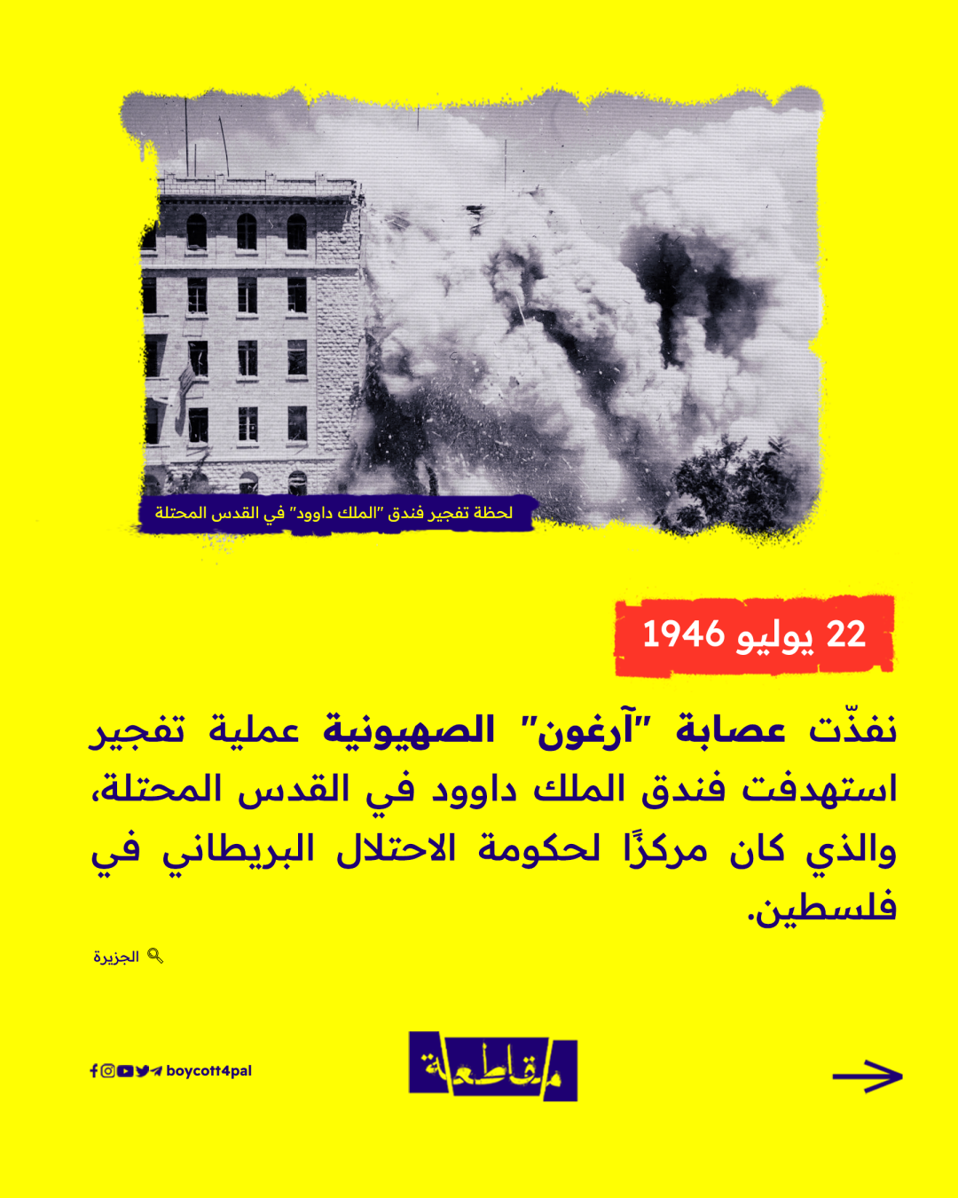 كان هذا شعار عصابات "آرغون" الصهيونية، التي نفذت قبل 77 عامًا أول عملية إرهابية في تاريخ المنطقة، بنسف فندق "الملك داوود" في القدس المحتلة.