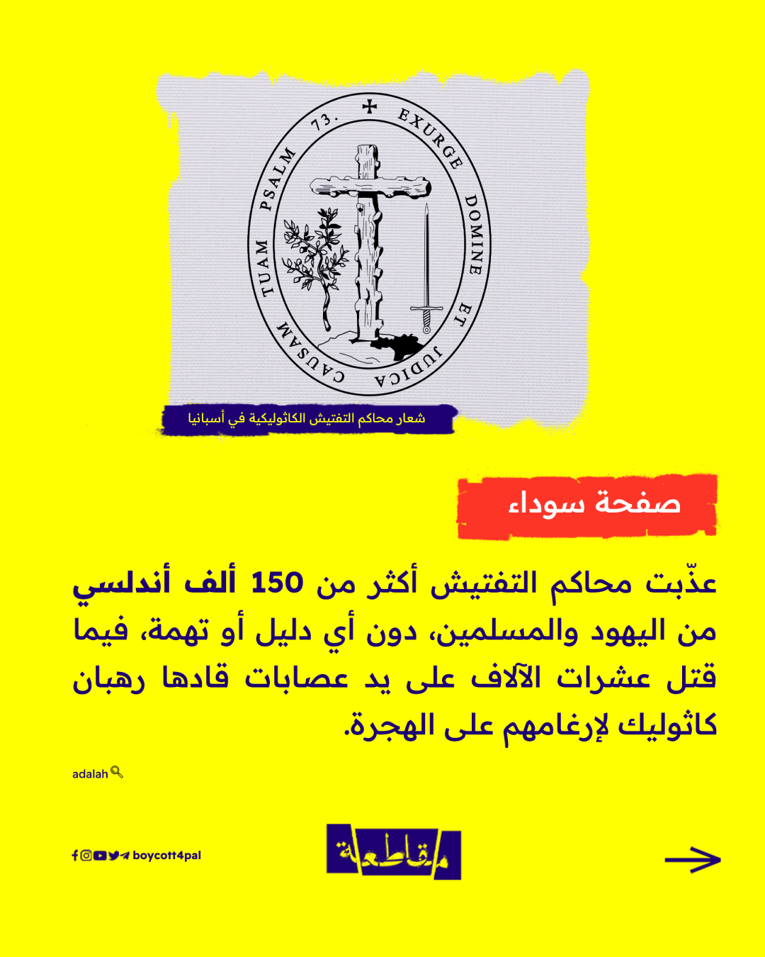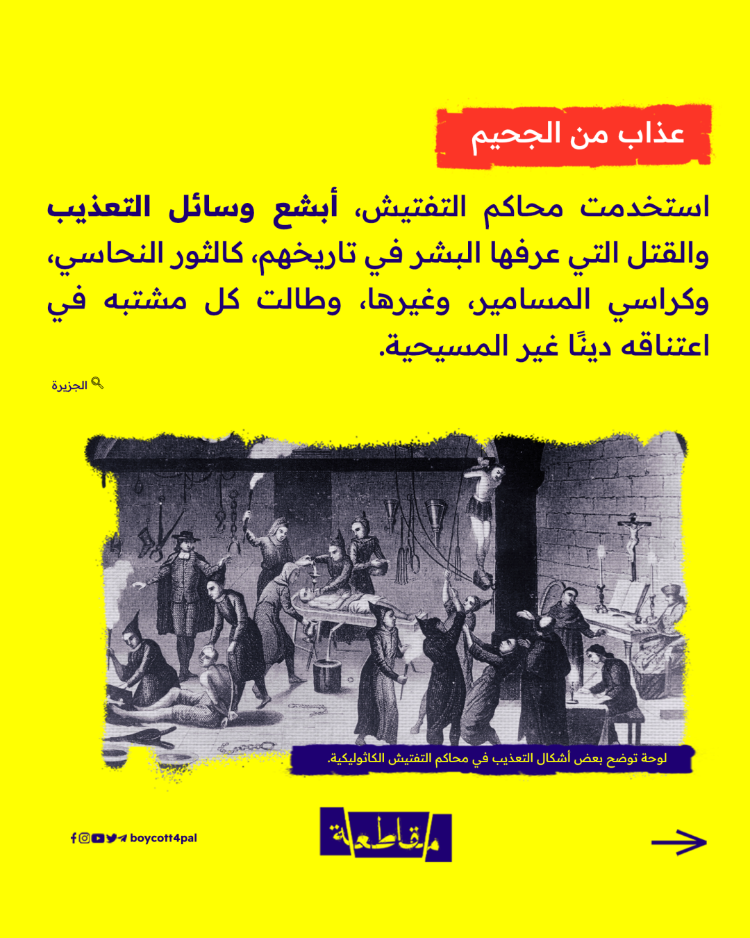 محاكم التفتيش: الجريمة التاريخية، والكلمة التي حفظها التاريخ كمختصر لعقود من أبشع أساليب التعذيب والتطهير العرقي التي ذاق ويلاتها المسلمون واليهود من أهل الأندلس، يستولي الاحتلال الإسرائيلي عليها اليوم، ويستخدمها في حملاته التحريضية ضد كل من يدعو لمحاسبته على جرائمه.