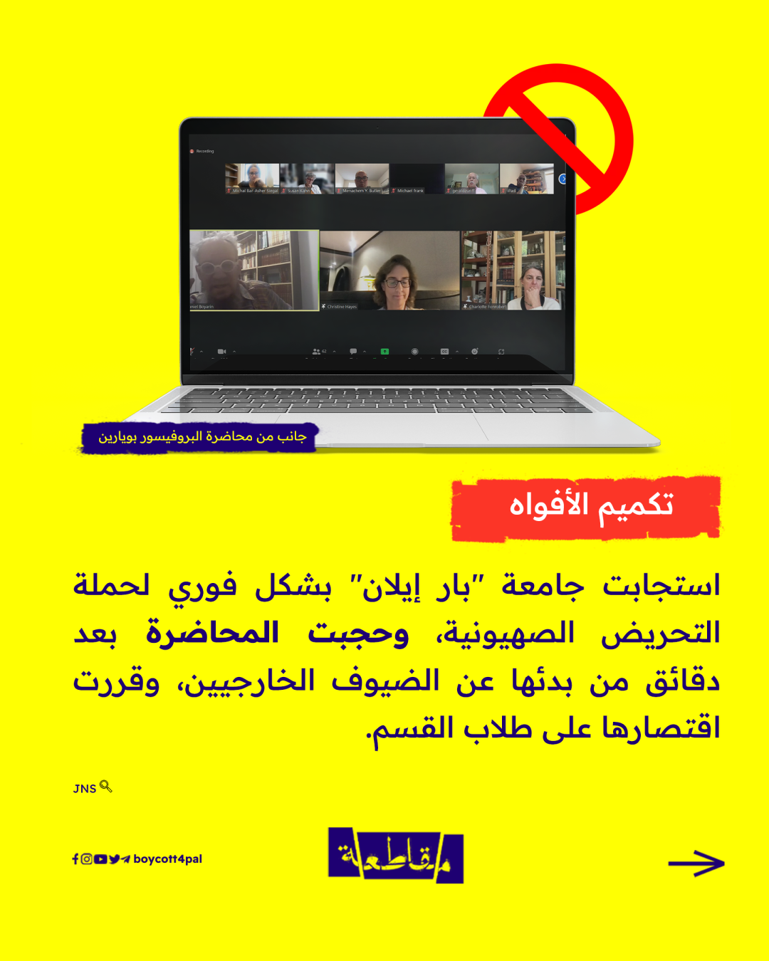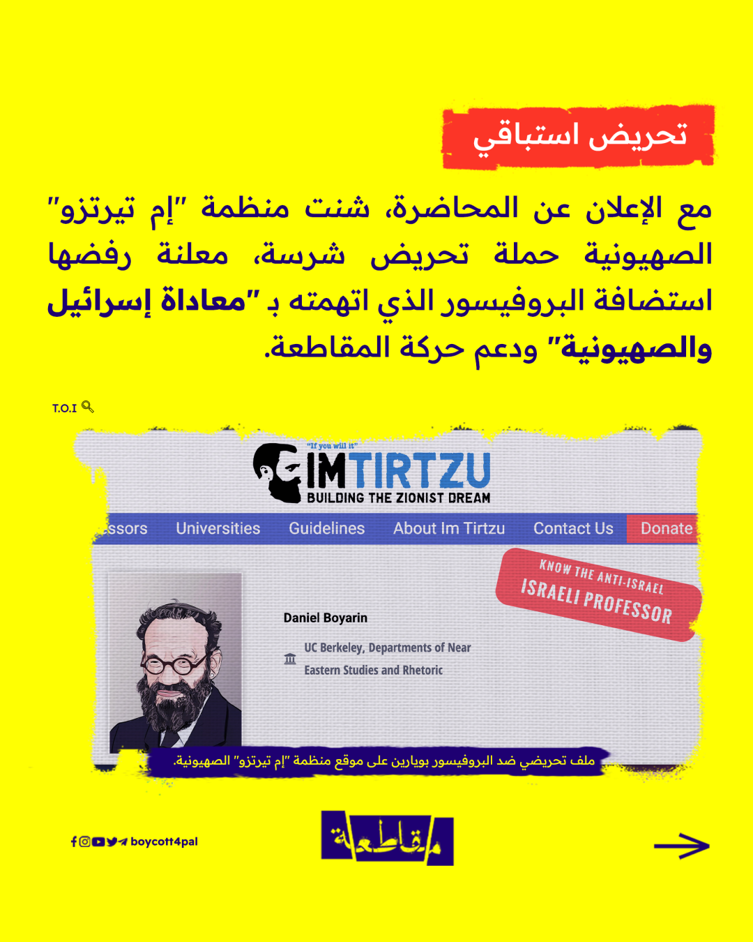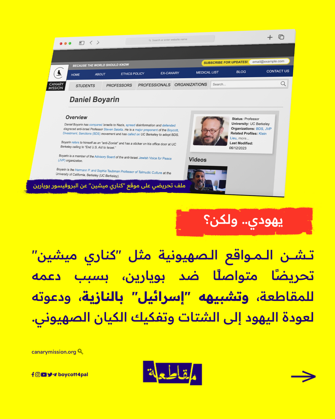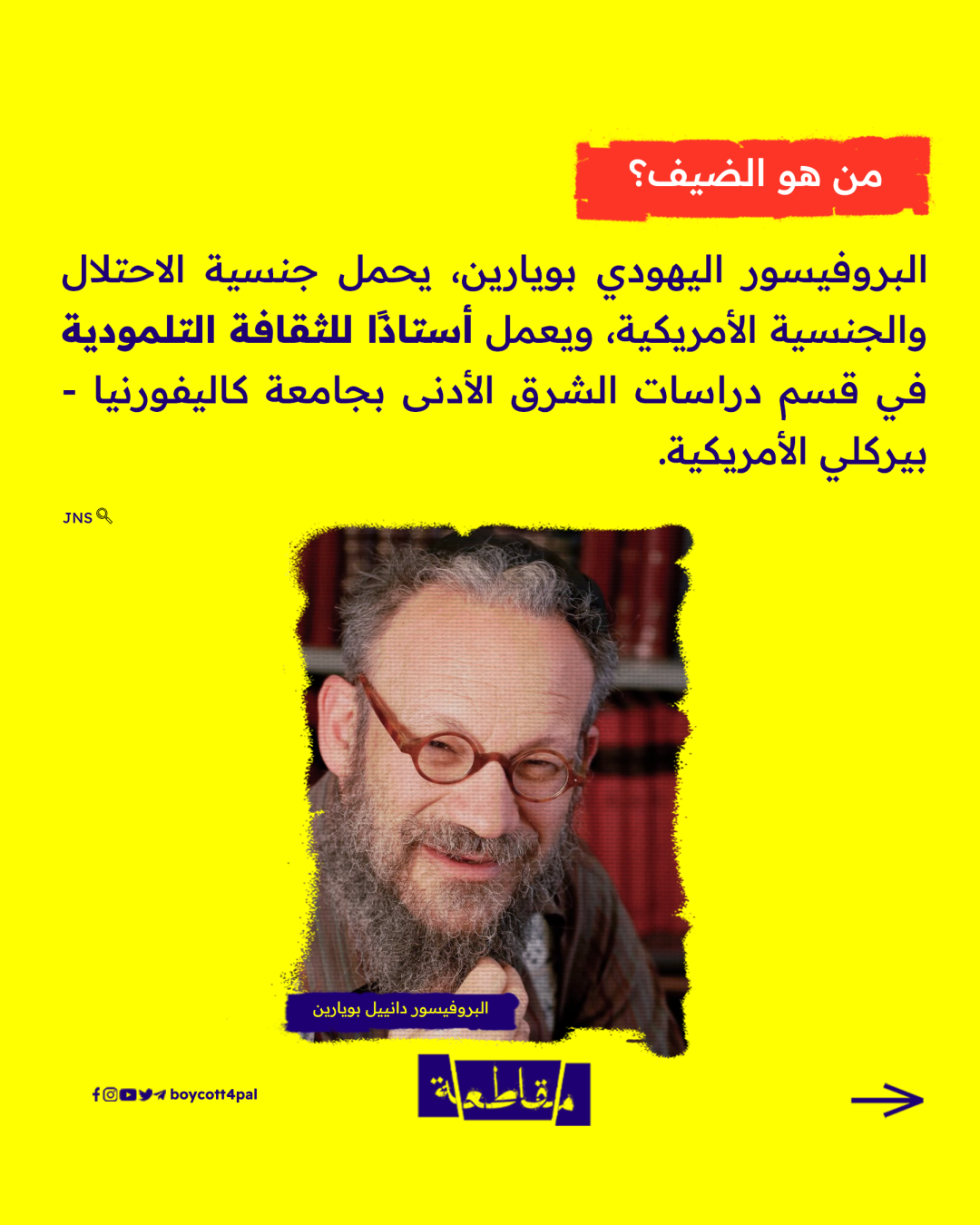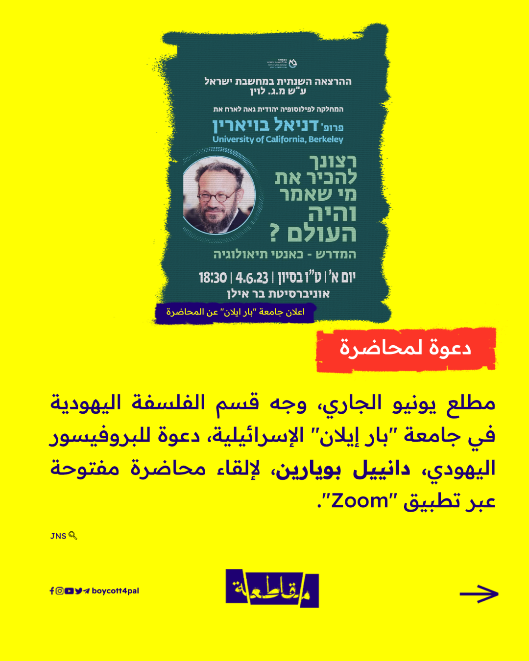 دانييل بويارين، أكاديمي منعته جامعة “بار إيلان” من تقديم محاضرة افتراضية، تواطئًا واستجابة لتحريض منظمات صهيونية متطرفة.