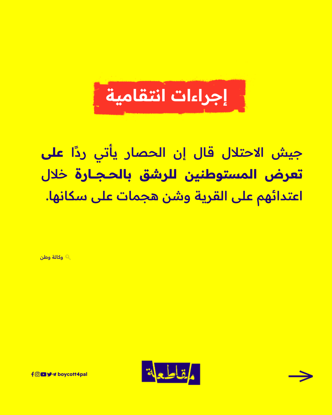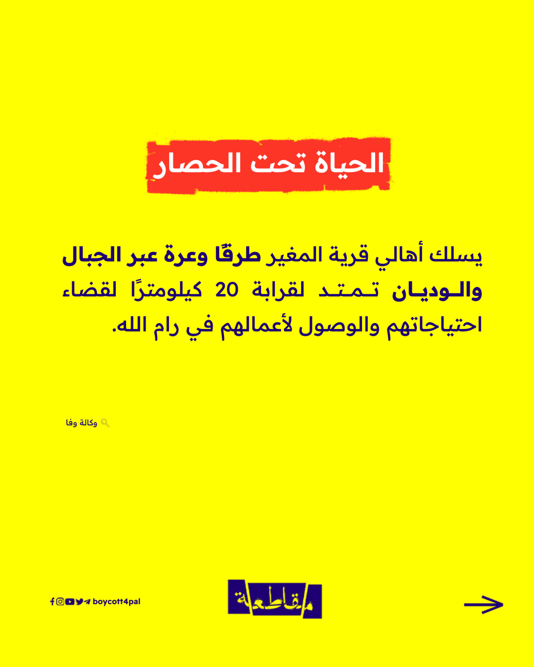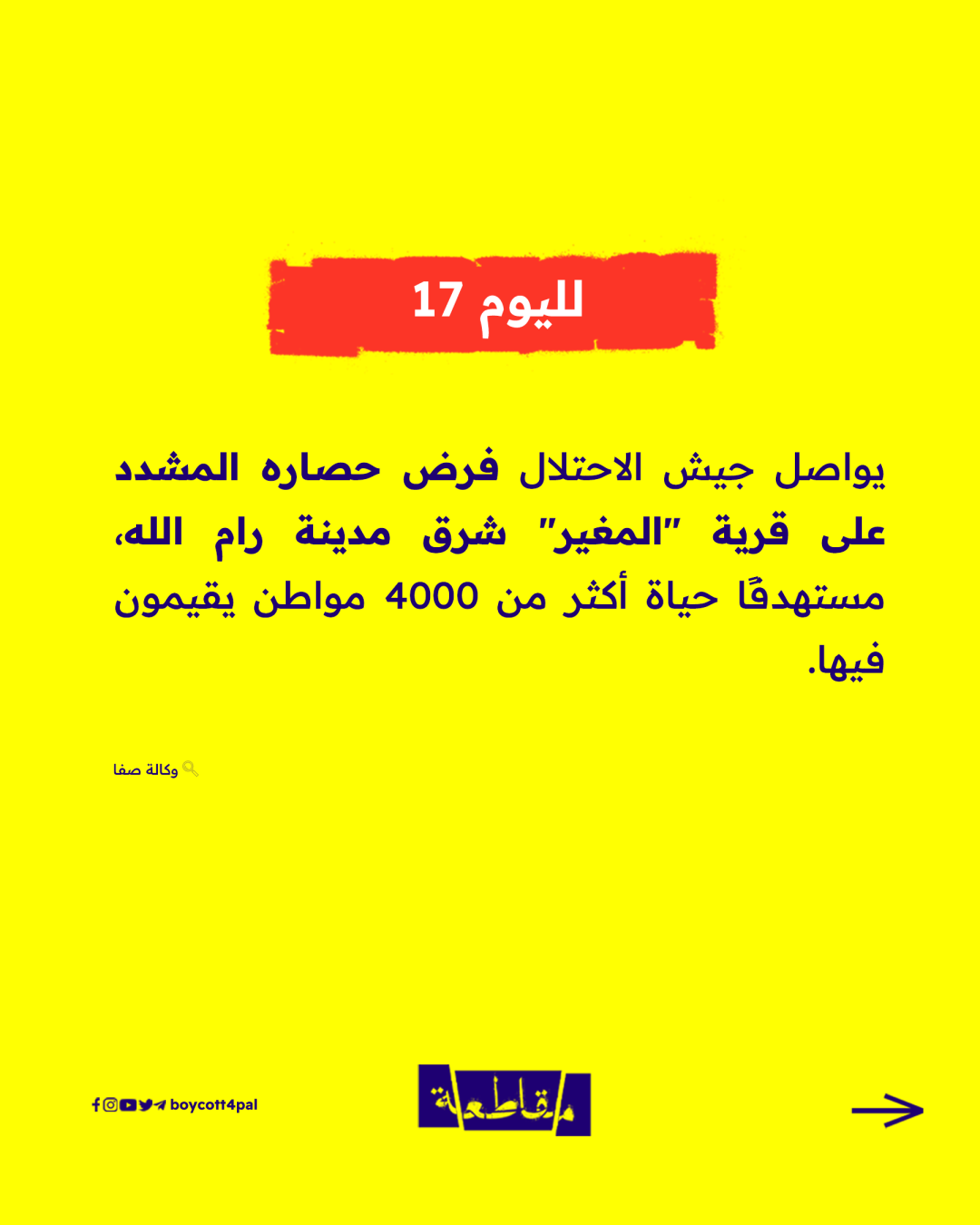 منذ 17 يومًا، يواصل جيش الاحتلال حصار قرية المغير في رام الله، وفرض قيود مشددة على سكانها، مهددًا بمواصلة فرض الحصار إلى أن “يعتذر” أهل المغير لعصابات المستوطنين عن قيامهم بالتصدي لهجمات المستوطنين الإرهابية على القرية، والتعهد بعدم التعرض لهم مجددًا!