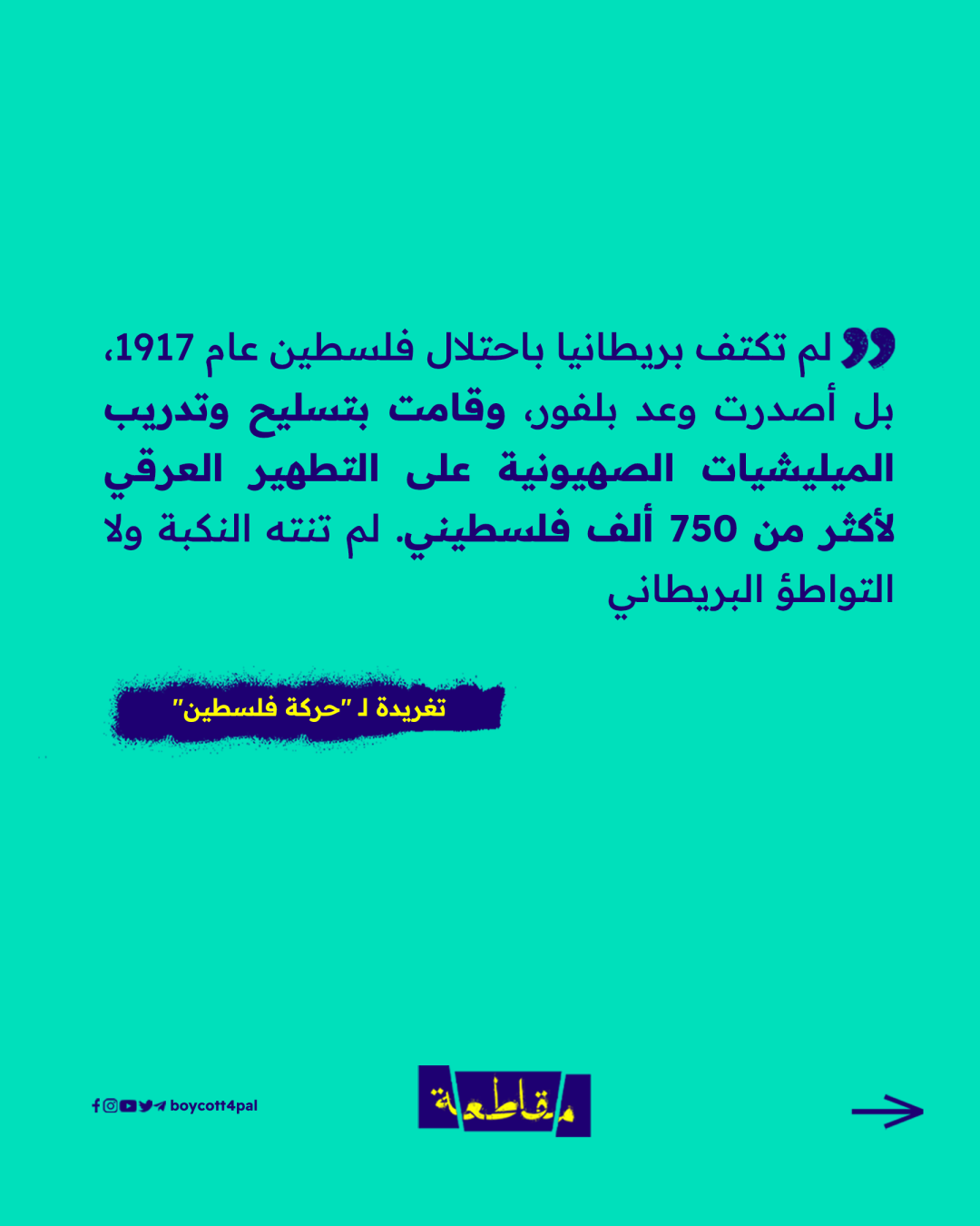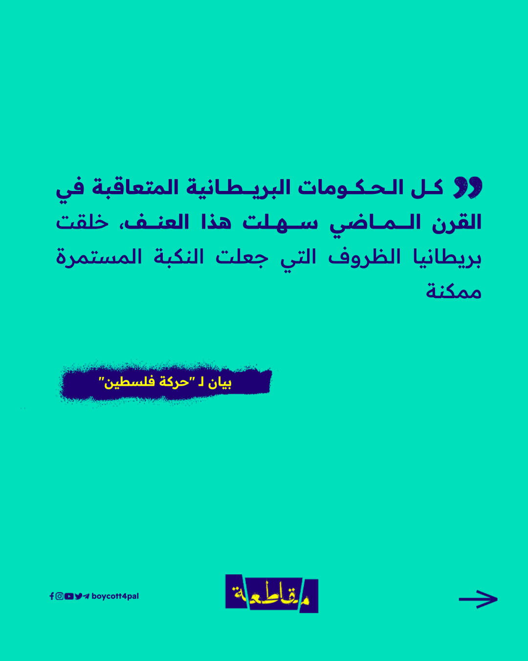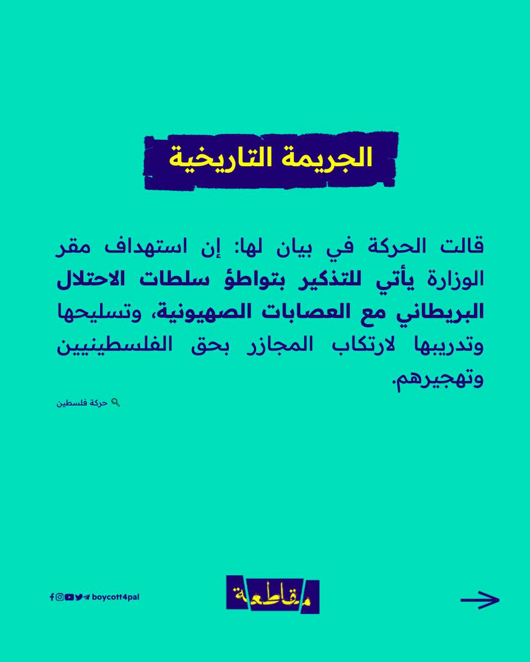 الحركة قالت أن الهجوم يهدف للتذكير بالتواطؤ التاريخي لبريطانيا وحكوماتها في جريمة احتلال فلسطين وتطهيرها عرقيًا بالمجازر والتهجير.