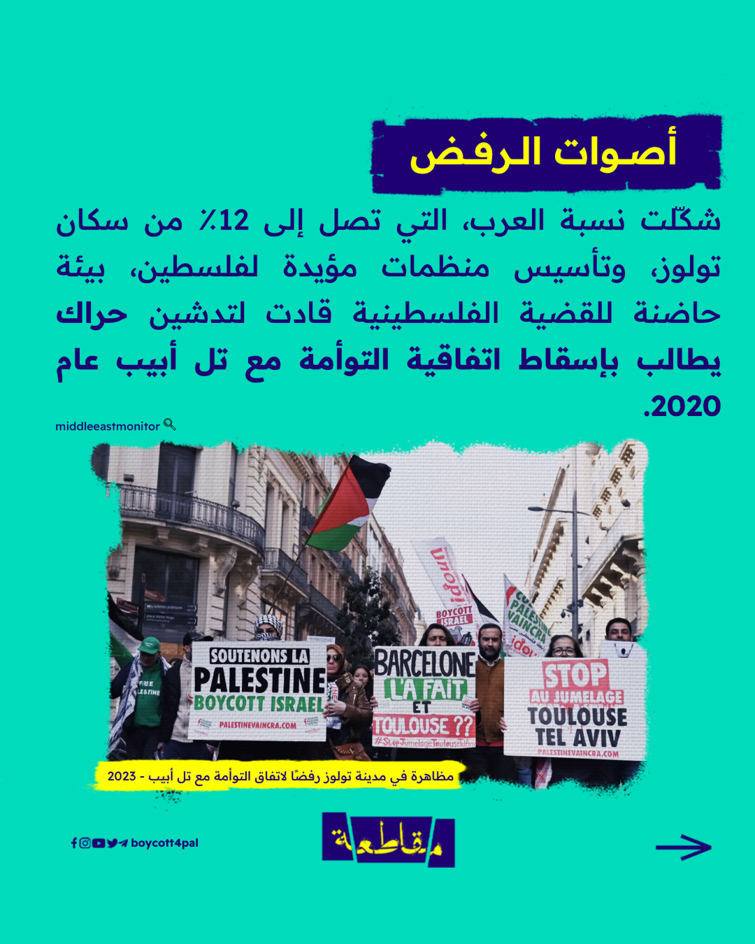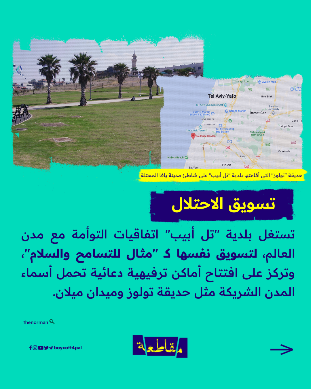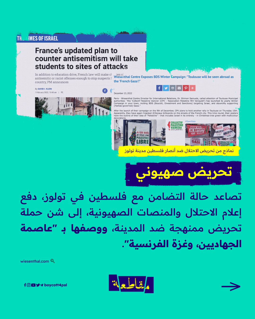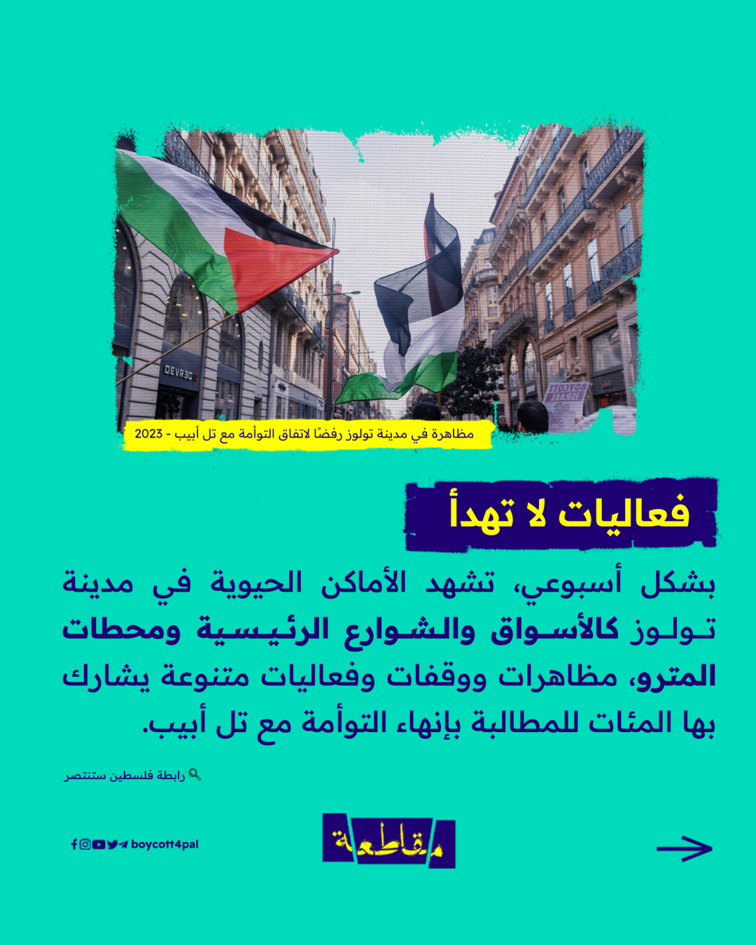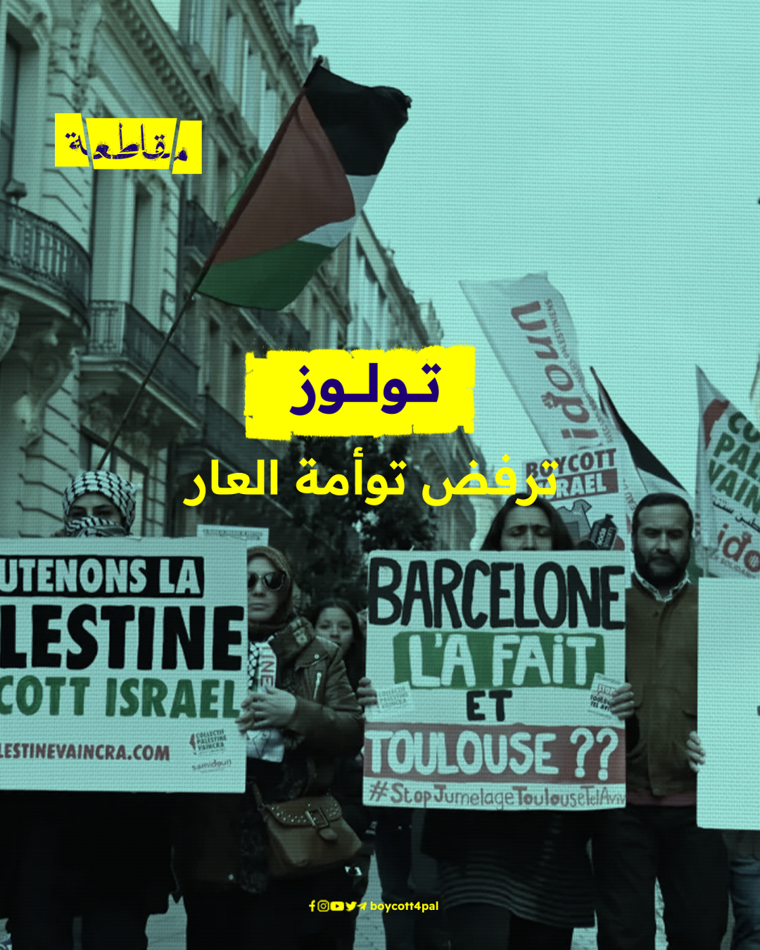 حراك لا يهدأ، فعاليات ومظاهرات تستهدف اسقاط "توأمة العار" بين تولوز الفرنسية وتل أبيب، وتستمد زخمها من الخطوات الشجاعة لمدن برشلونة ولييج وليل بقطع العلاقات مع الاحتلال.