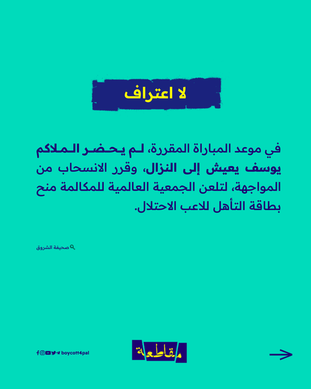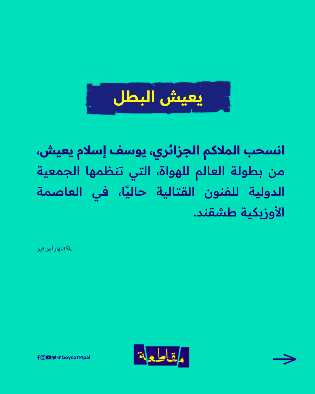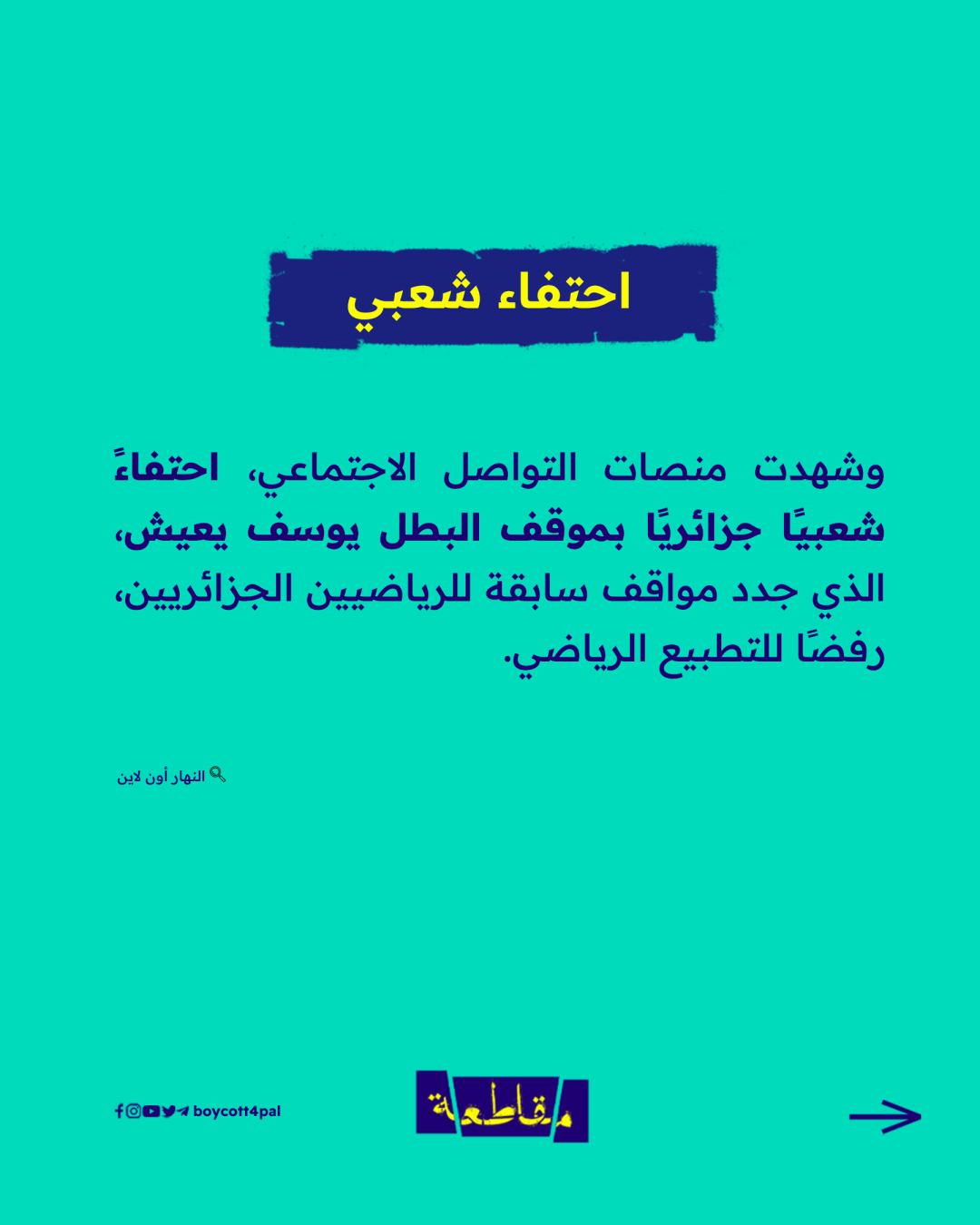 يوسف يعيش، بطل عربي جديد يدون اسمه في قائمة الشرف للرياضيين الذين رفضوا التطبيع الرياضي، وفضلوا الانسحاب وخسارة الألقاب، على مواجهة لاعبي الاحتلال، ومنحهم الشرعية والاعتراف.