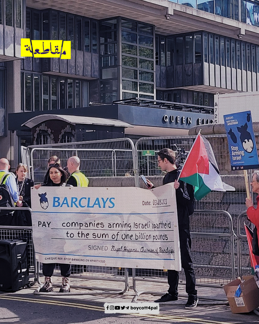 نظم عشرات المتضامنين وأنصار حملة التضامن مع فلسطين في العاصمة لندن، وقفة أمام قاعة “إليزابيث” التي تضم اجتماعات الهيئة العمومية لبنك باركليز، للمطالبة بوقف دعم الاحتلال والتورط في جرائمه بحق الفلسطينيين في الأراضي المحتلة.