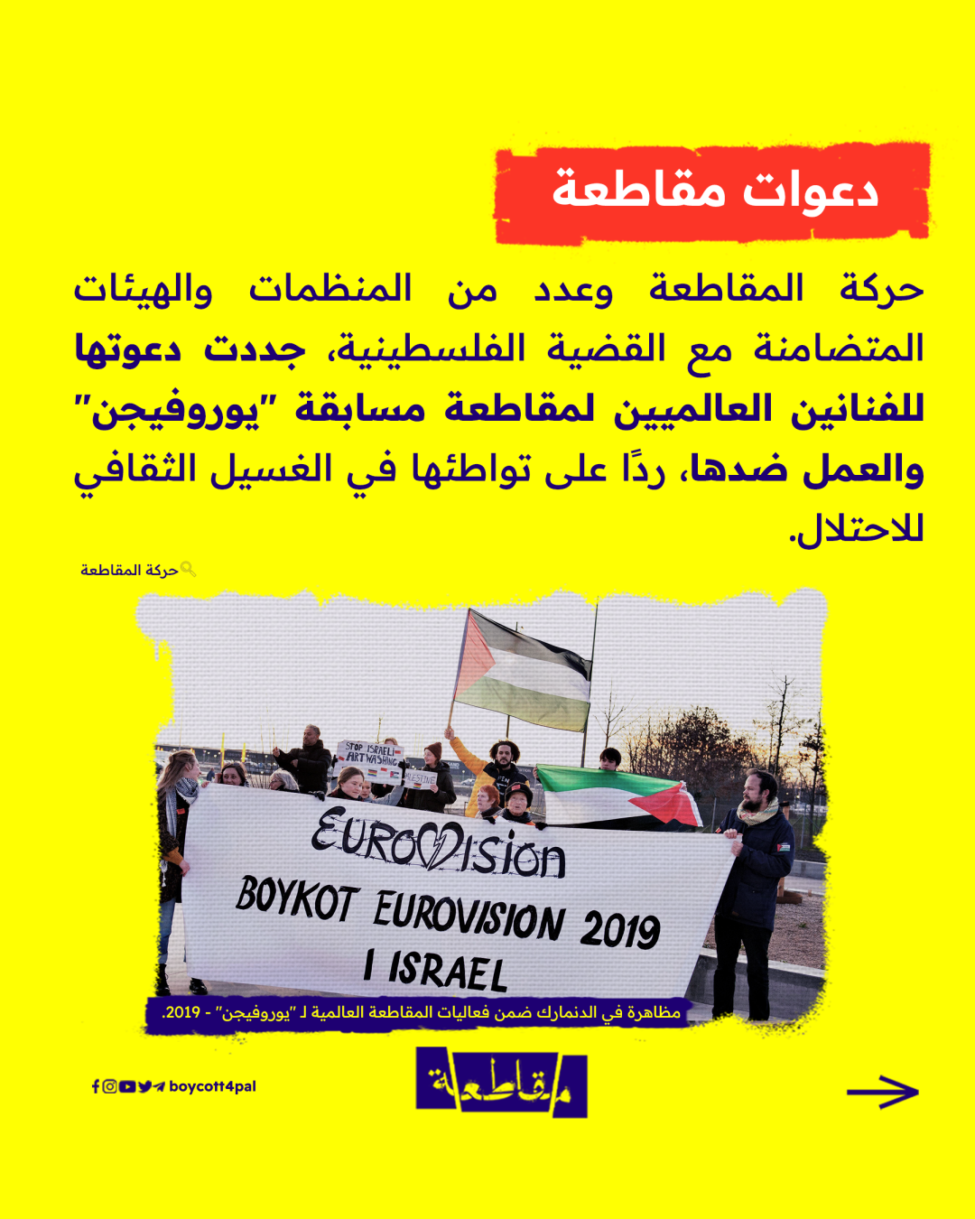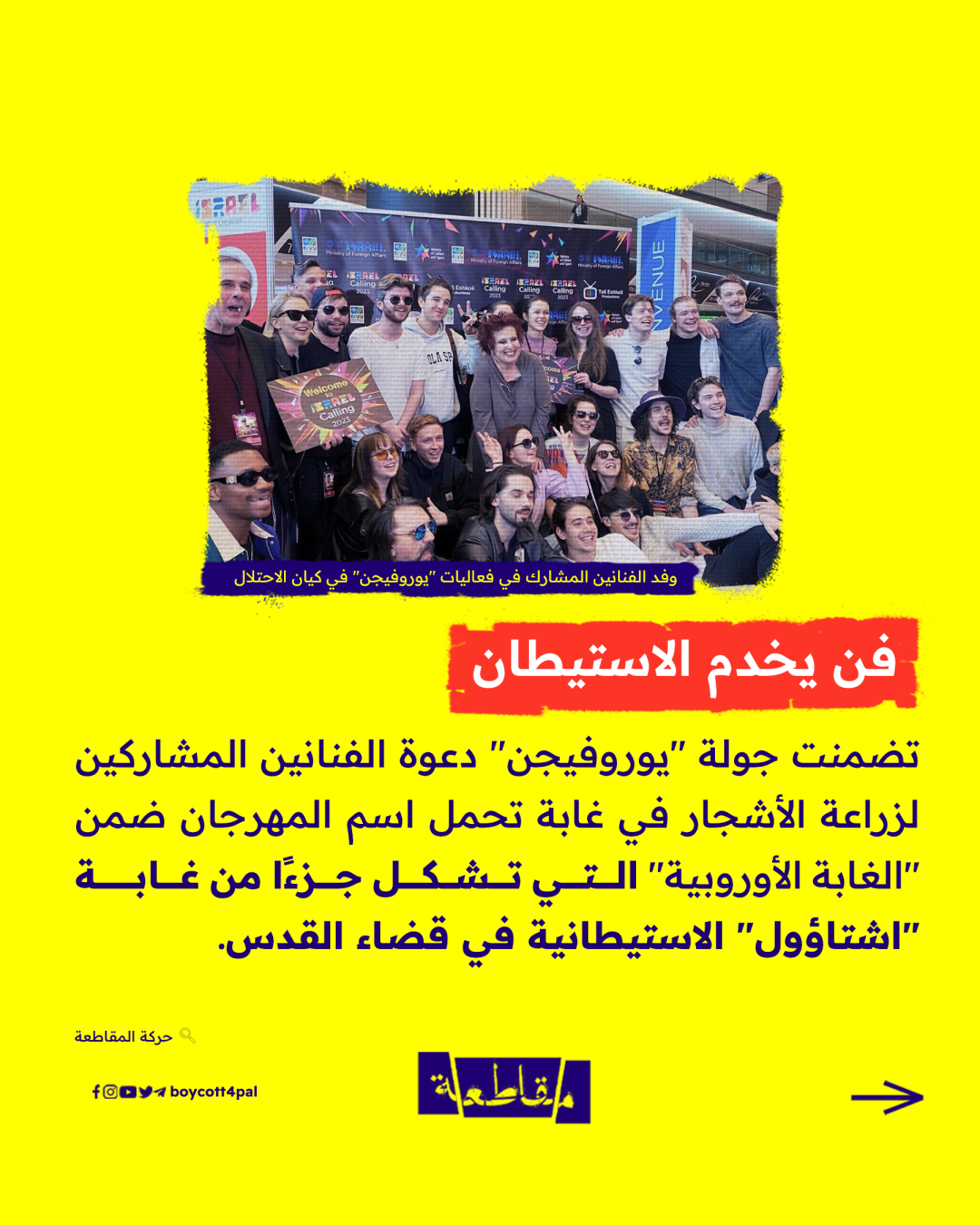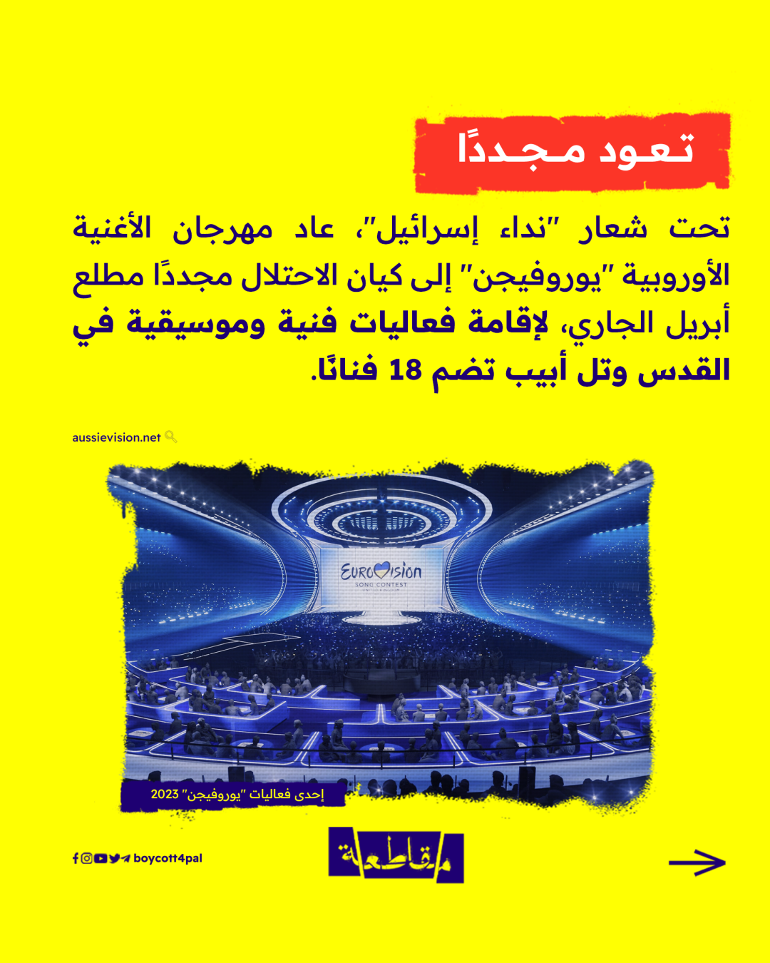 مهرجان الأغنية الأوروبية "يوروفيجين" لم يكتف بالمساهمة بالغسيل الفني للاحتلال، لينتقل للمشاركة المباشرة بجريمة استيطان وتهويد القدس عبر وفود فنانيه، لتبدأ حملة مقاطعة جديدة ضد المهرجان، تذكرنا بهزيمته القاسية حينما اختار الكيان لاستضافة نسخة 2019.