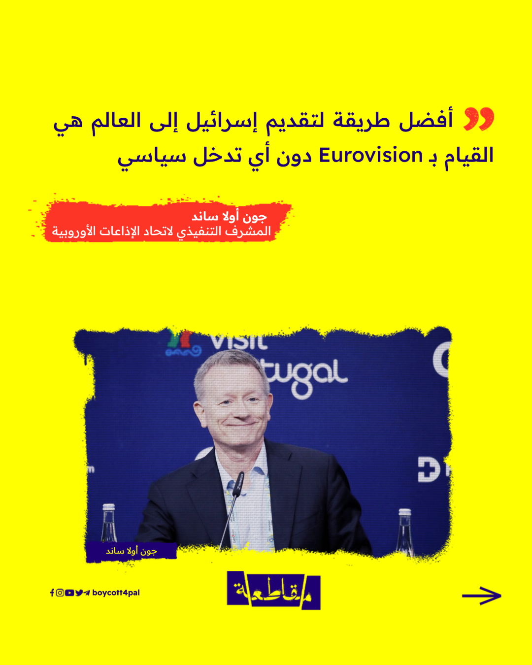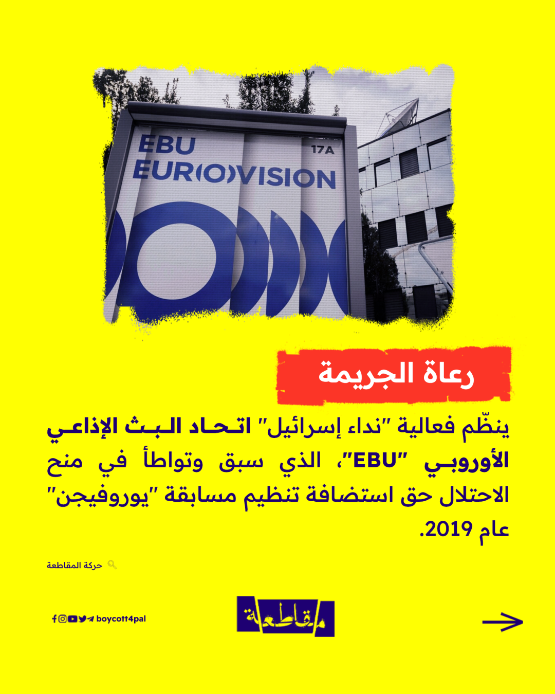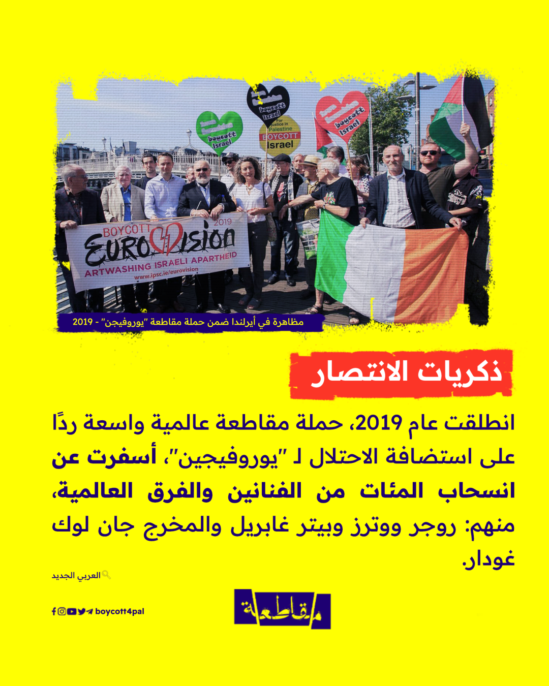 مهرجان الأغنية الأوروبية "يوروفيجين" لم يكتف بالمساهمة بالغسيل الفني للاحتلال، لينتقل للمشاركة المباشرة بجريمة استيطان وتهويد القدس عبر وفود فنانيه، لتبدأ حملة مقاطعة جديدة ضد المهرجان، تذكرنا بهزيمته القاسية حينما اختار الكيان لاستضافة نسخة 2019.