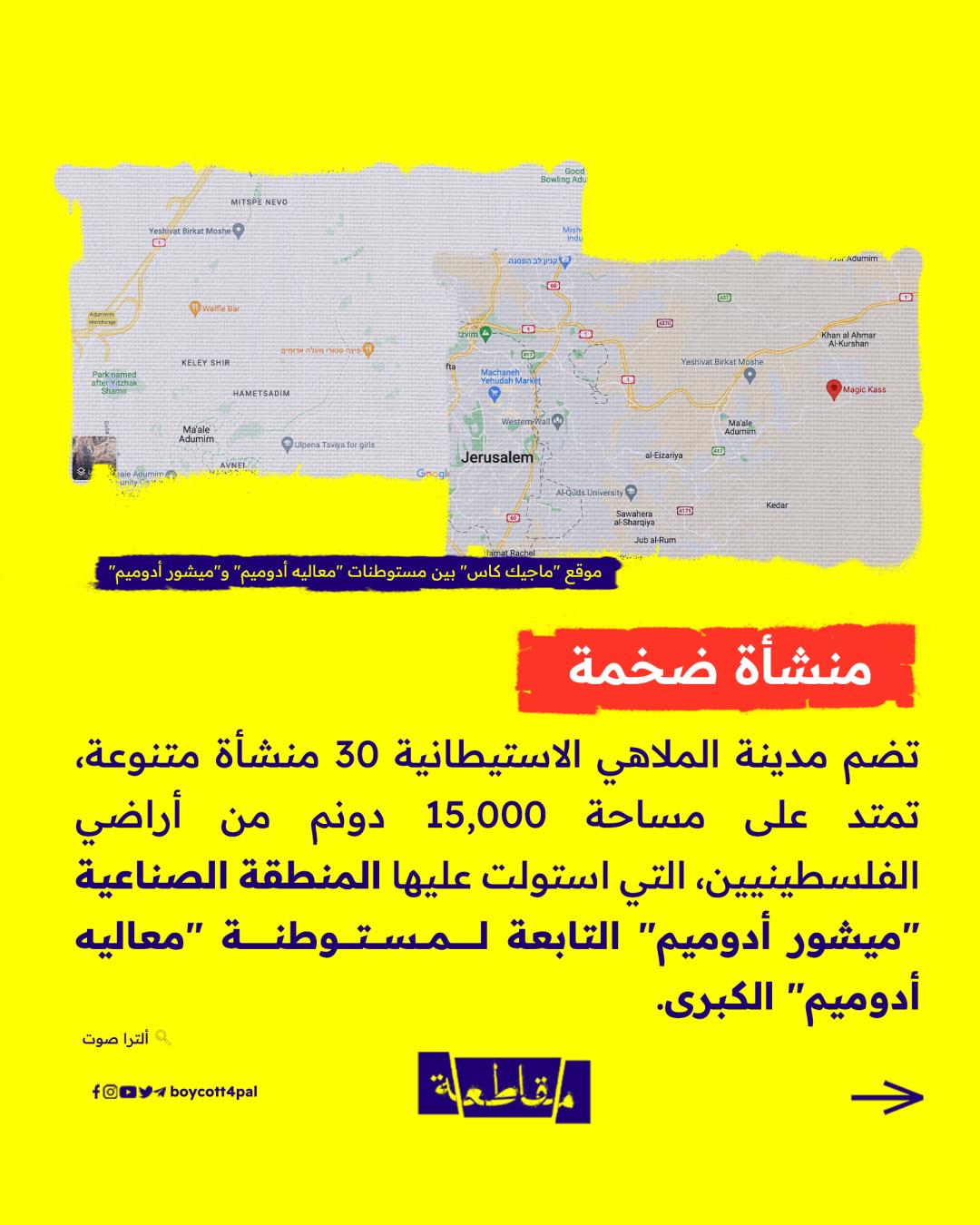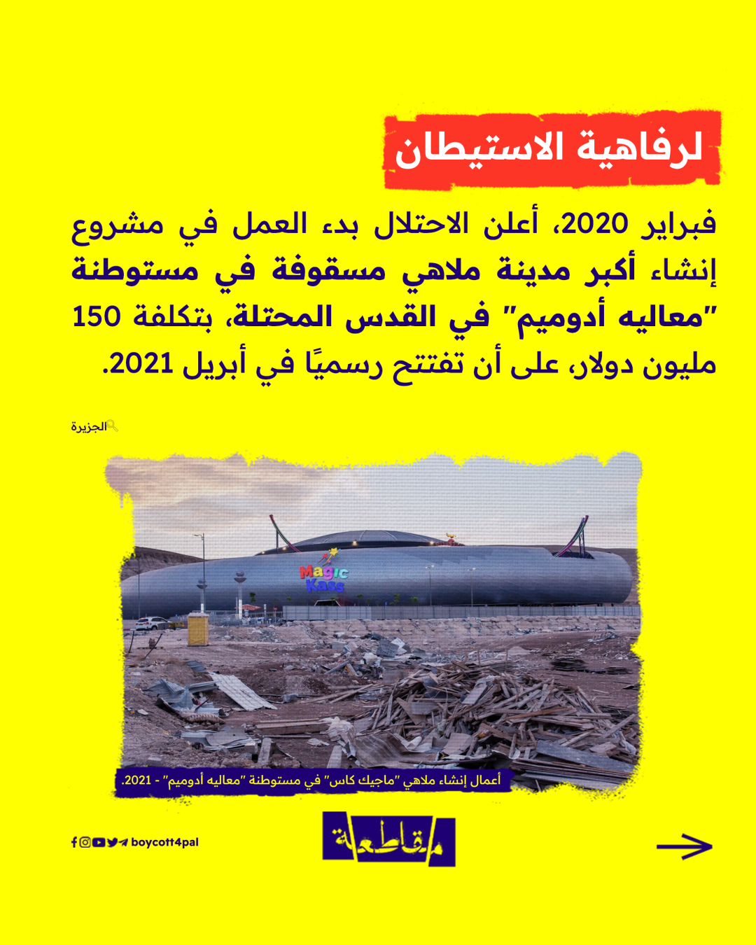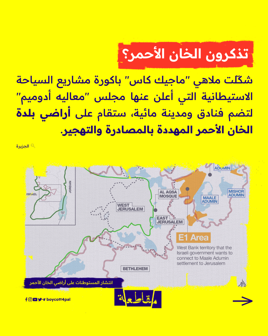 ليست ملاهي!، بل امتدادٌ لمستوطنة "معاليه أدوميم"، مُغتصِبة بلدتي العيزرية وأبو ديس شرقي القدس، وتهديدٌ يطال الخان الأحمر.