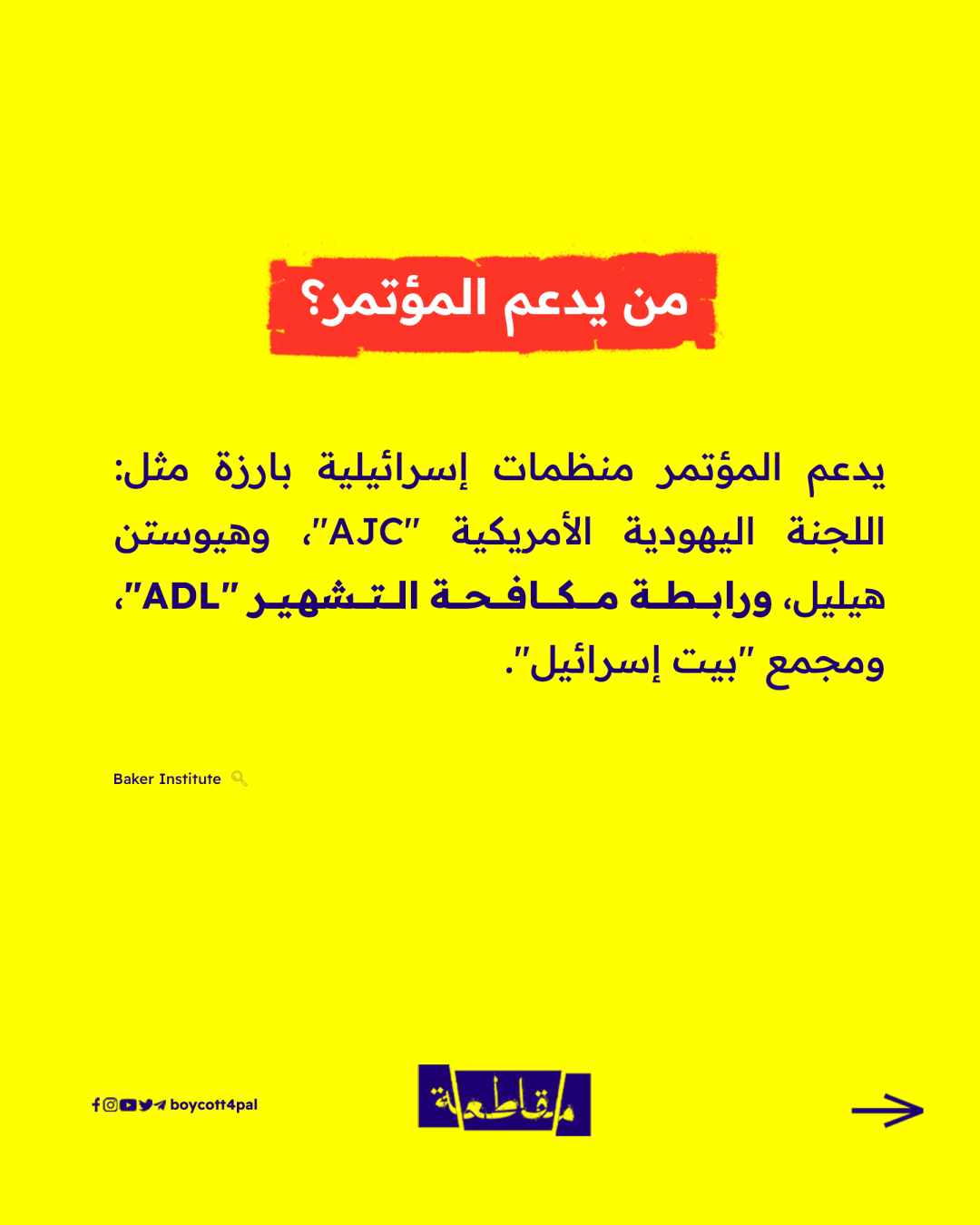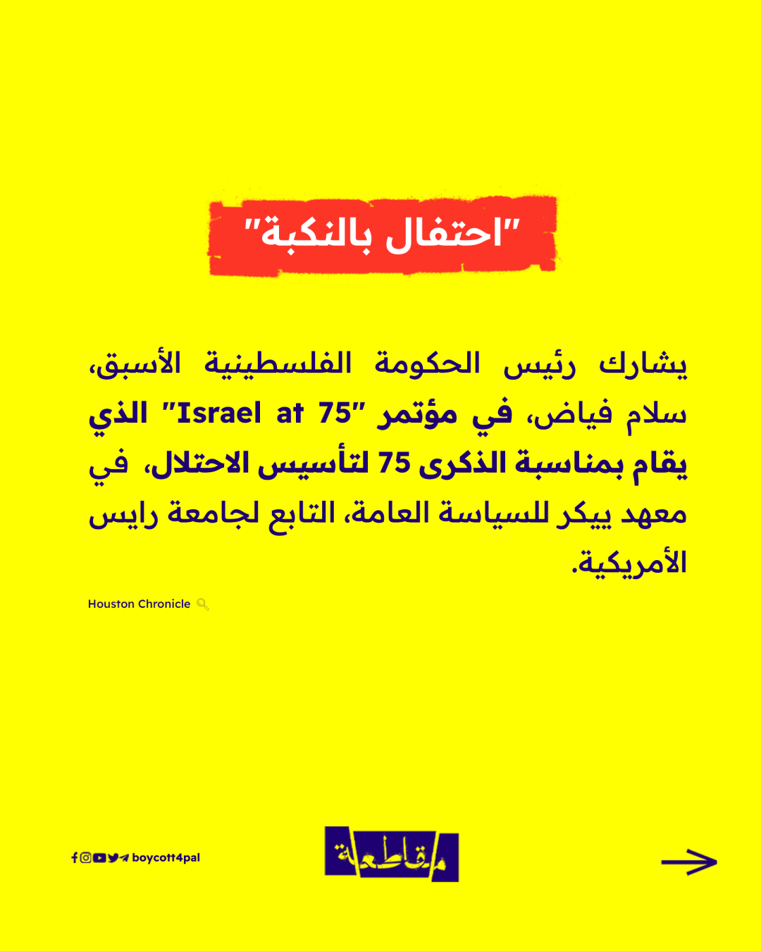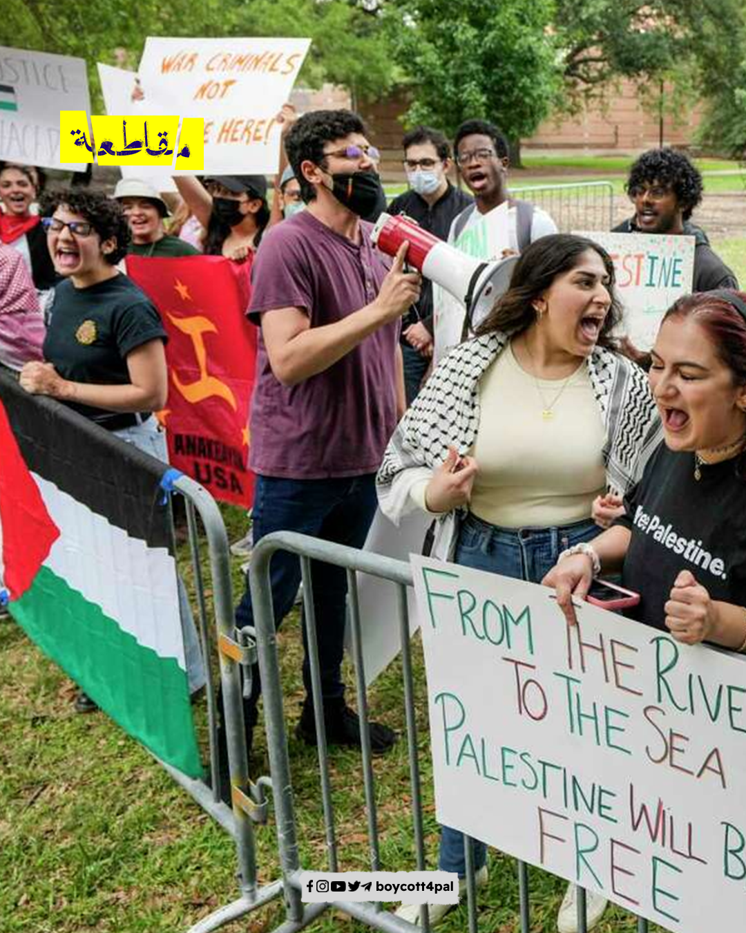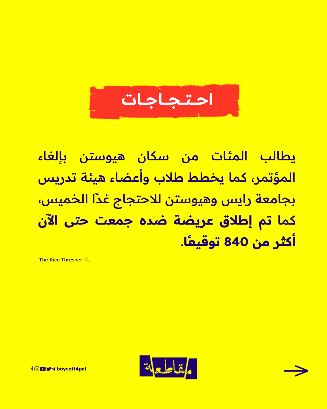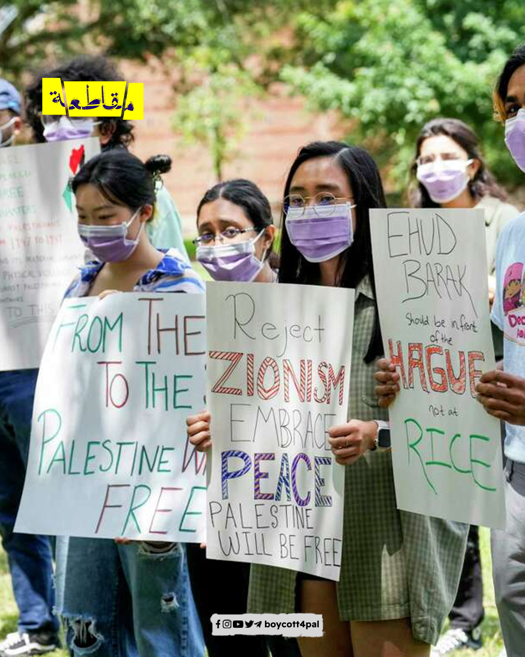 تظاهر العشرات من طلاب جامعة “رايس” الأمريكية أمام معهد “بيكر”، رفضًا لانعقاد فعاليات مؤتمر "إسرائيل في 75"، الذي يشارك فيه دبلوماسيون أمريكيون وأجانب بحضور شخصيات إسرائيلية عسكرية وسياسية.