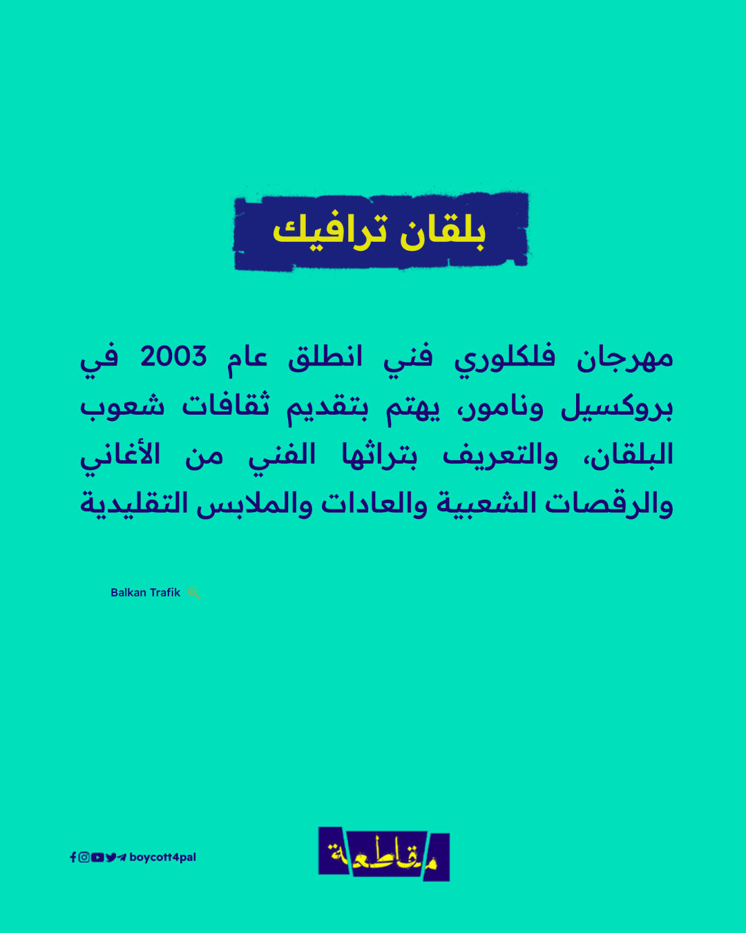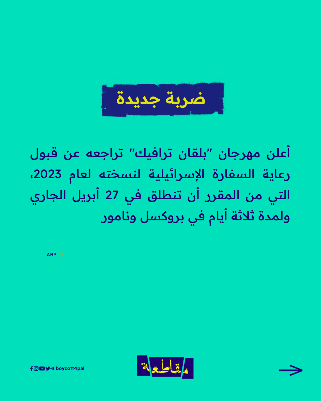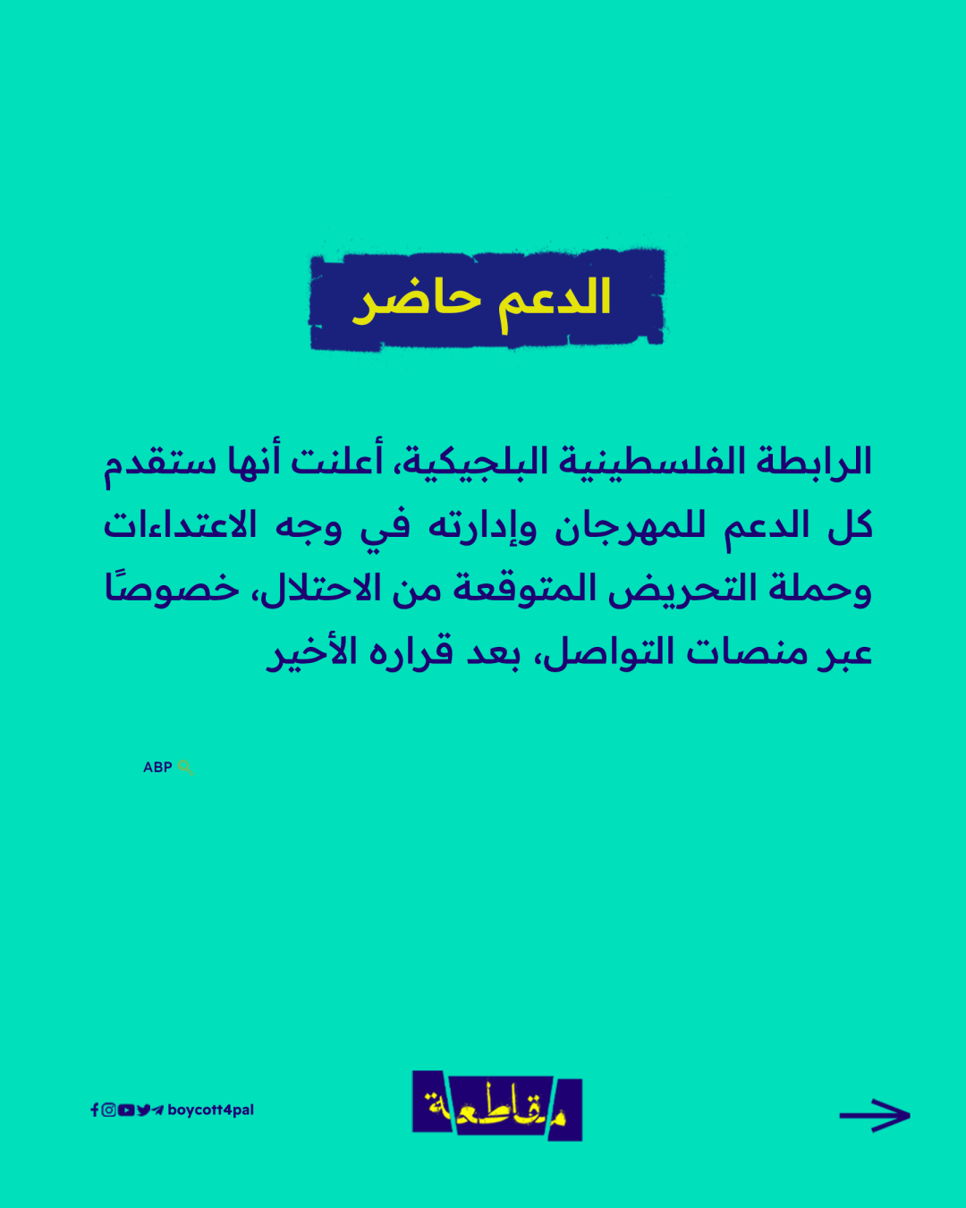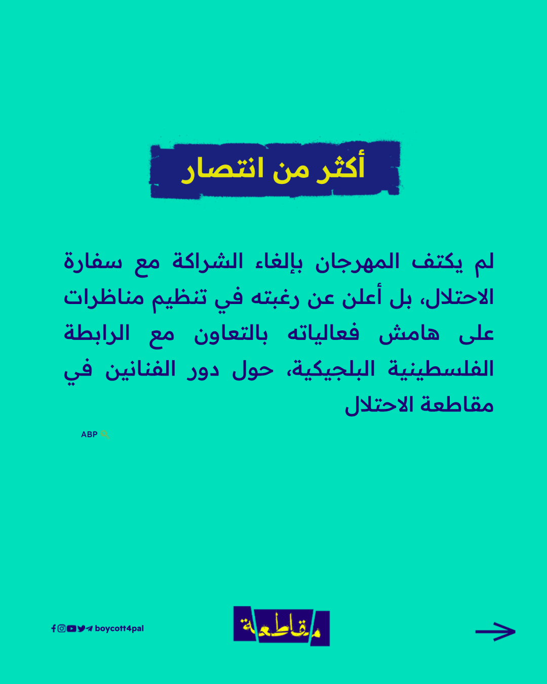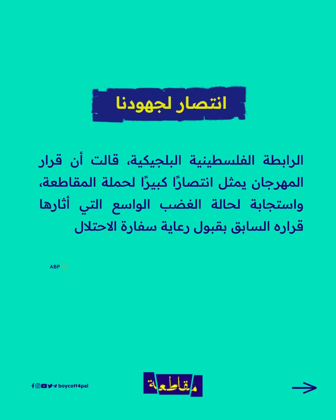 أكدت الرابطة البلجيكية الفلسطينية أن رعاية الأحداث الثقافية تعتبر جزءًا لا يتجزأ من سياسة "إسرائيل" في تبييض سياستها الإجرامية للقمع الممنهج للشعب الفلسطيني.
