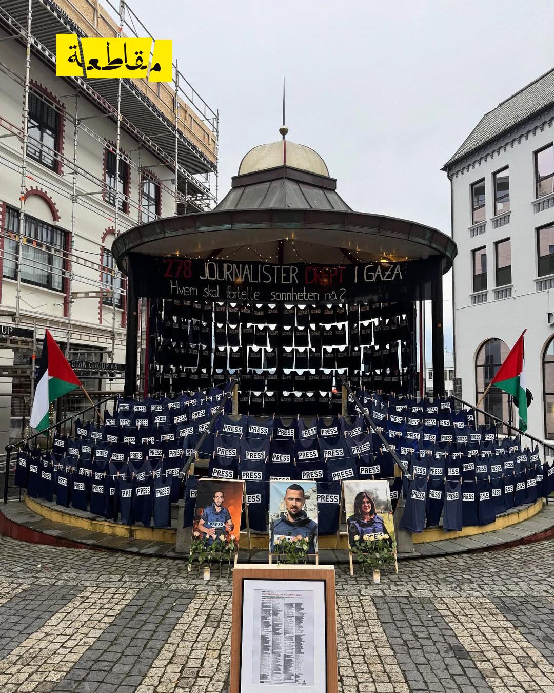 نظّم نشطاء في مدينة ألسوند النرويجية فعالية رمزية لتكريم الصحفيين الفلسطينيين الذين استُشهدوا خلال العدوان على غزة، حيث عُلّقت عشرات سترات الصحافة الزرقاء في ساحة عامة، كرمزٍ لزملائهم الذين فقدوا حياتهم أثناء تغطية الجرائم الإسرائيلية.