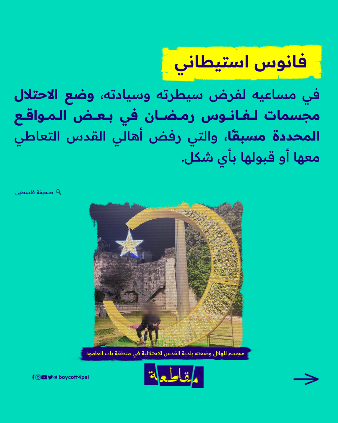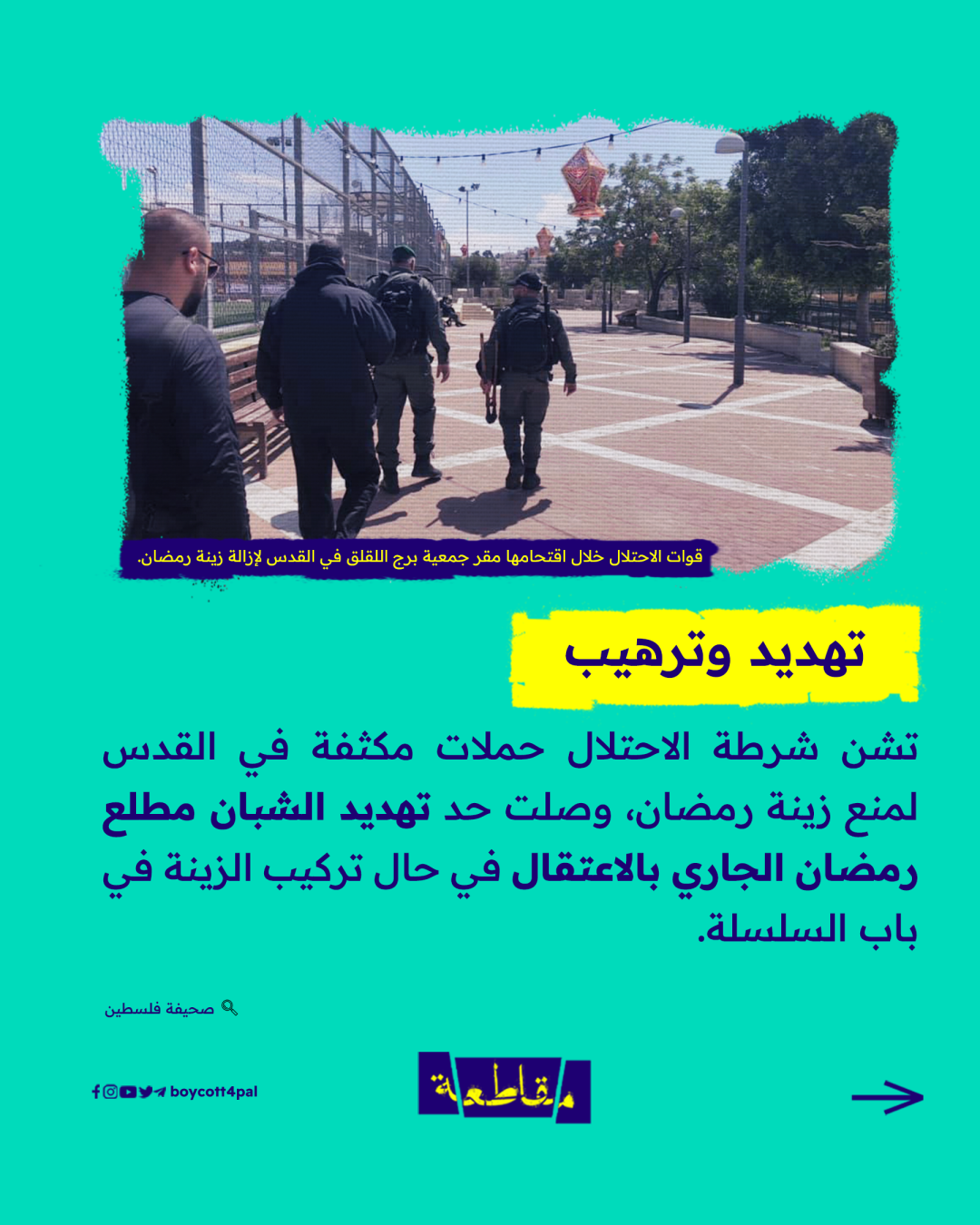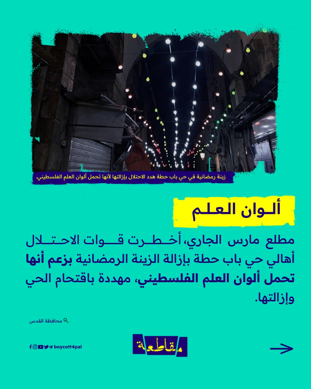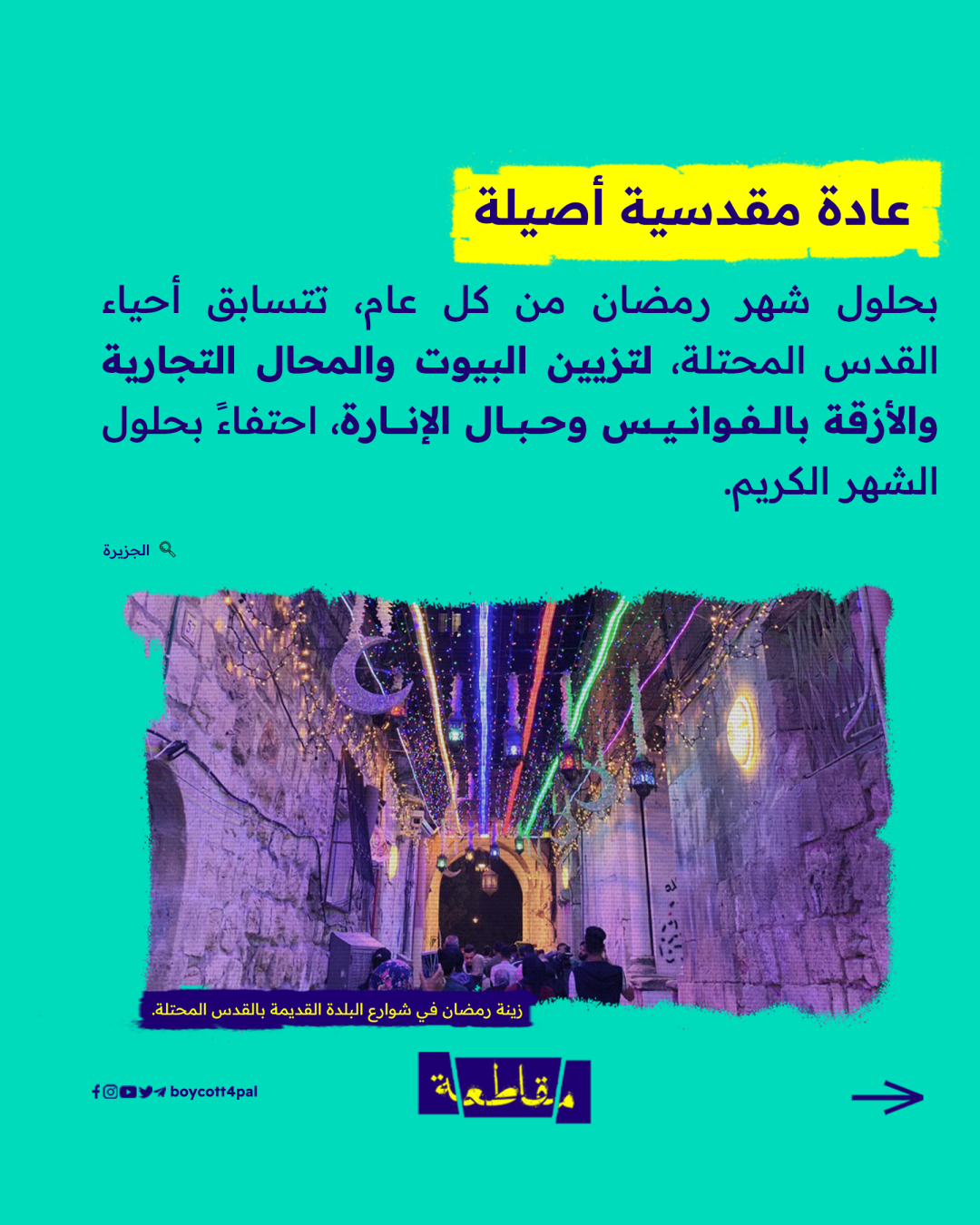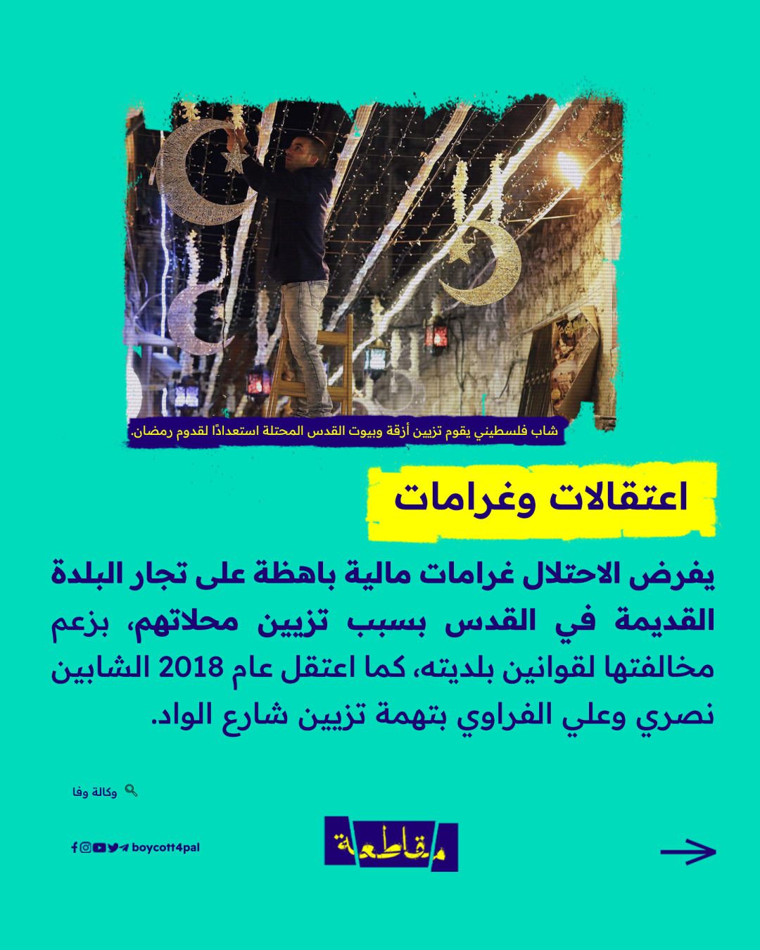 الفوانيس وحبال الإنارة الملونة، زينة #رمضان التي تحتفل بها مدن العالم، قد تعرضك في القدس للملاحقة والاعتقال من الاحتلال، وقد يُفرض عليك غرامات مالية باهظة لأنك رفعتها ابتهاجًا بحلول الشهر الكريم.