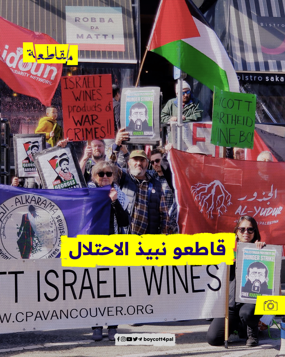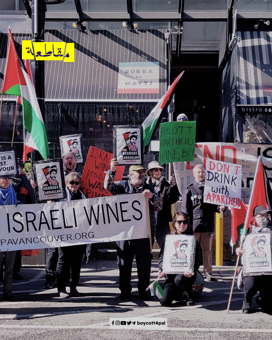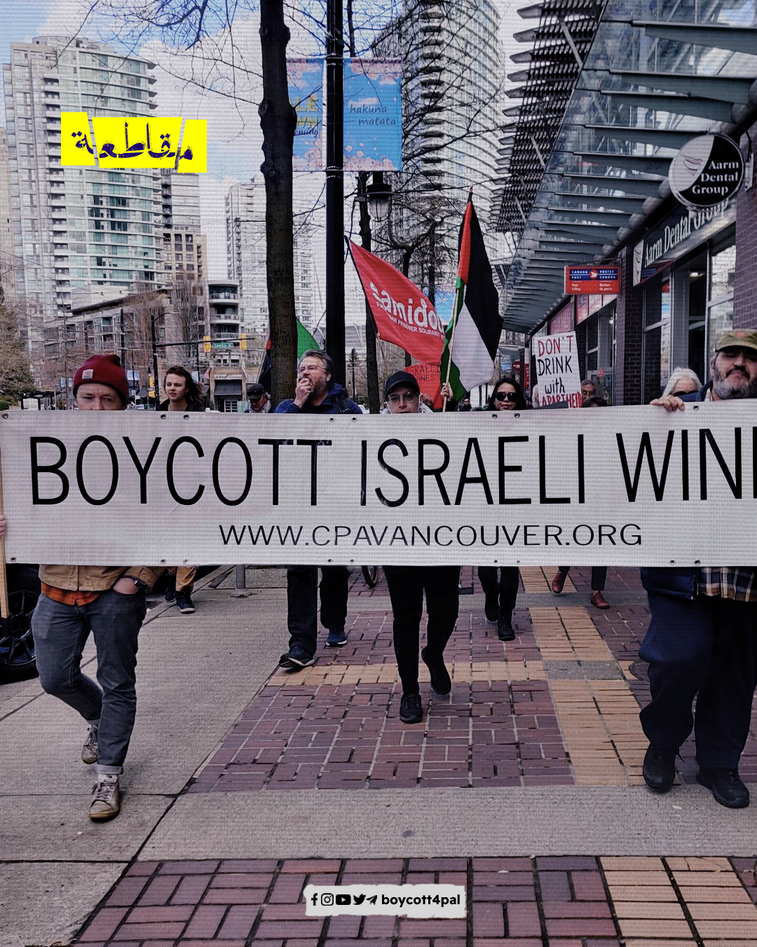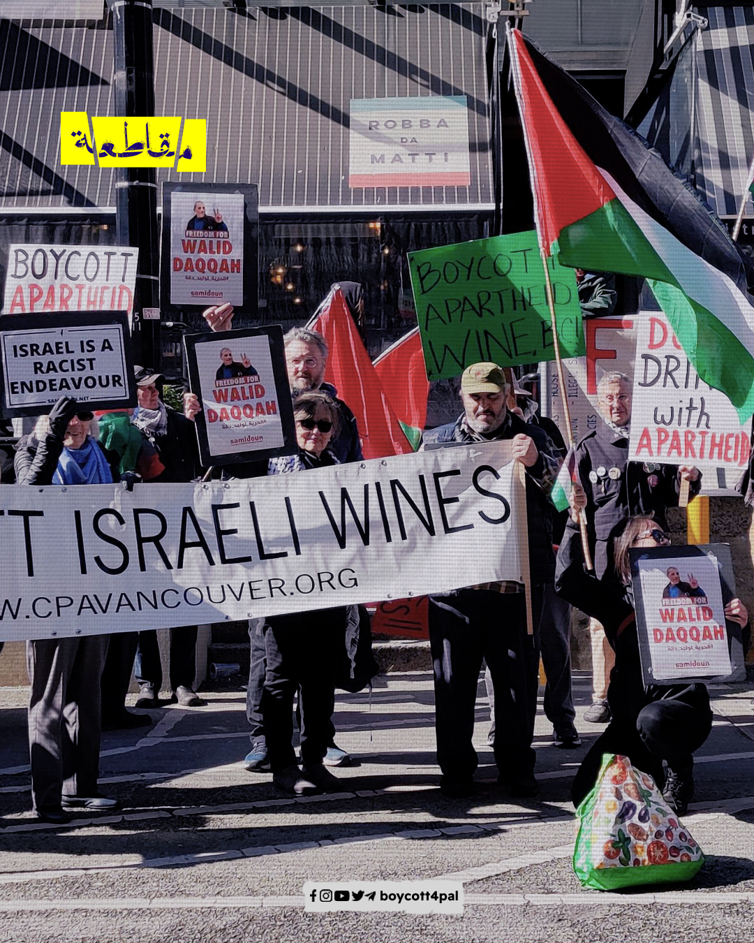 نظم نشطاء حركة المقاطعة وشبكة صامدون في فانكوفر، وقفة احتجاجية أمام متجر لبيع النبيذ الإسرائيلي المصنّع في المستوطنات المقامة على الأراضي الفلسطينية المحتلة، كما طالب المتظاهرون بالإفراج عن الأسرى، رافعين الأعلام الفلسطينية.