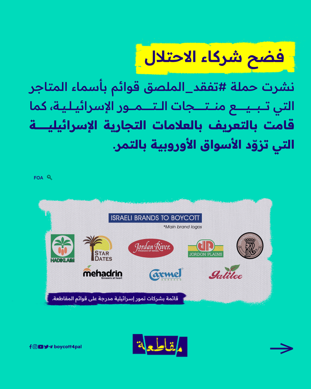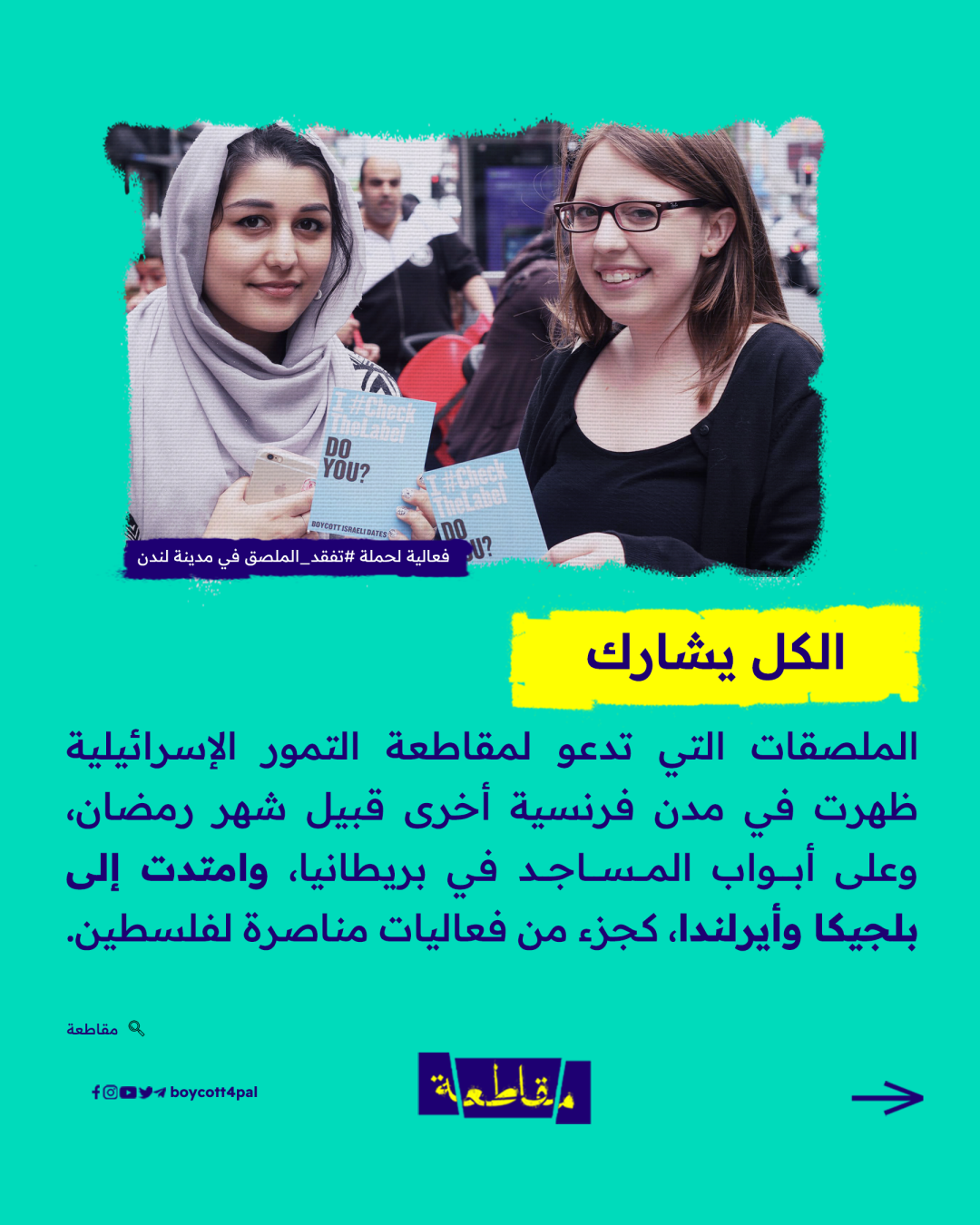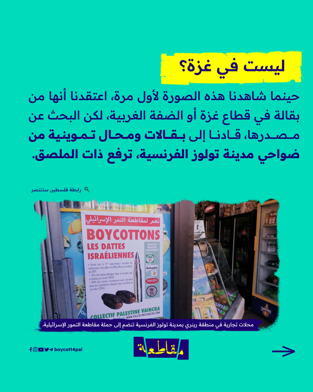 تجد ملصقاتها على رفوف البقالات الشعبية في تولوز، وأبواب المساجد في مانشستر، وامتدت إلى بلجيكا وإيرلندا وغيرها من الدول، لتحقق انتشارًا واسعًا في استهداف ومقاطعة منتجات تمور الاحتلال.