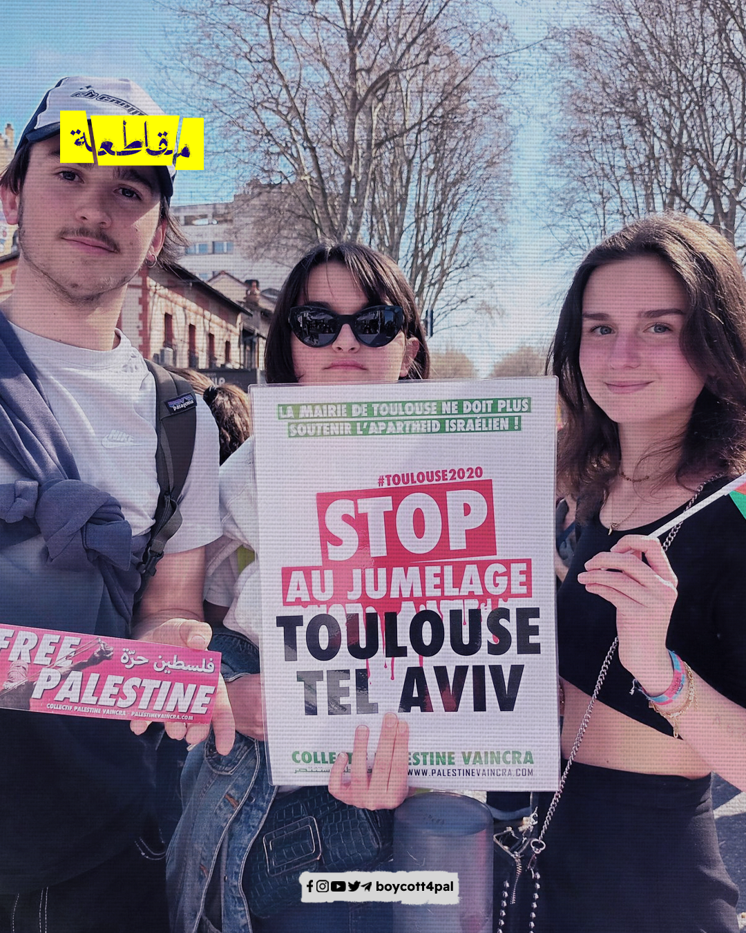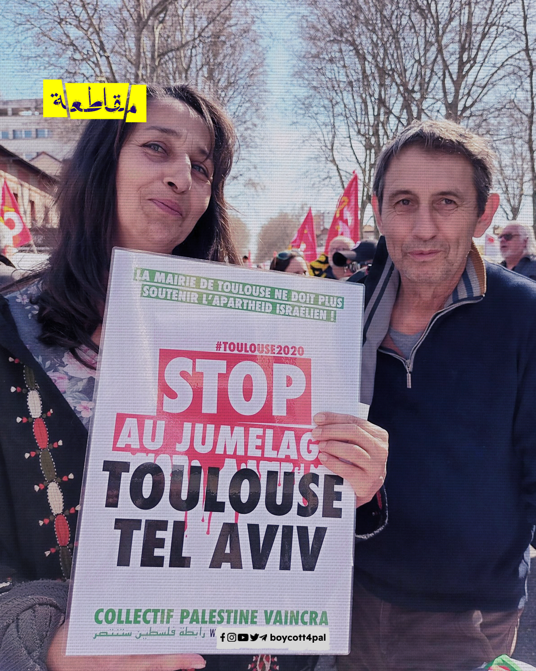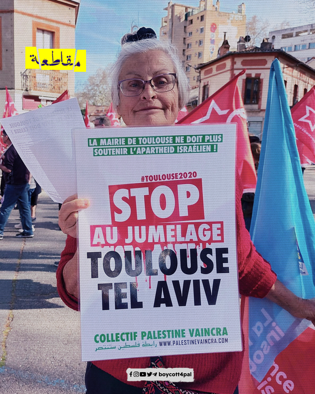 نظم نشطاء رابطة فلسطين ستنتصر وقفة احتجاجية في مدينة تولوز، للمطالبة بإلغاء التوأمة بين المدينة ومدينة "تل أبيب" الإسرائيلية، في ظل ارتفاع مستويات العنف في الأراضي الفلسطينية المحتلة.