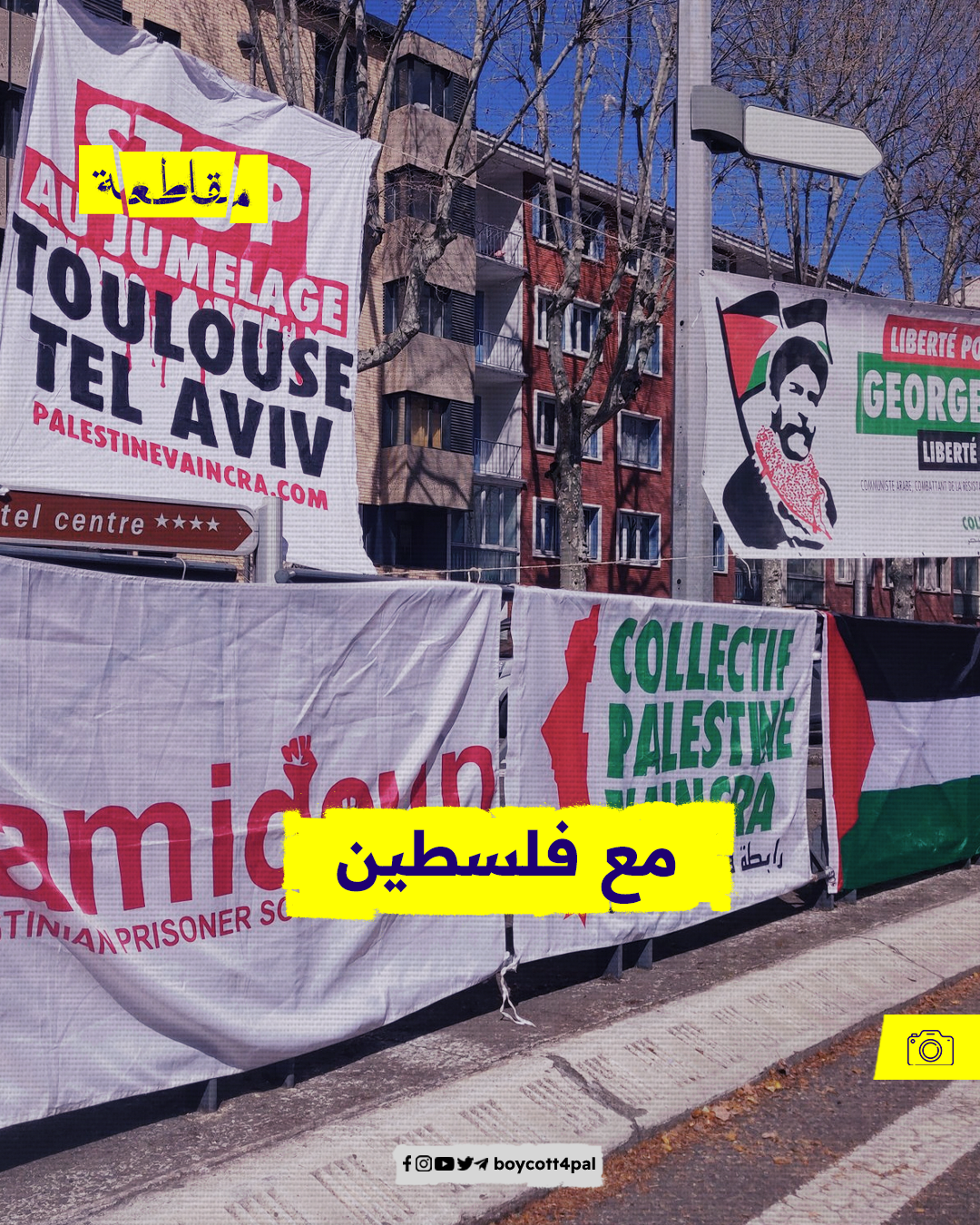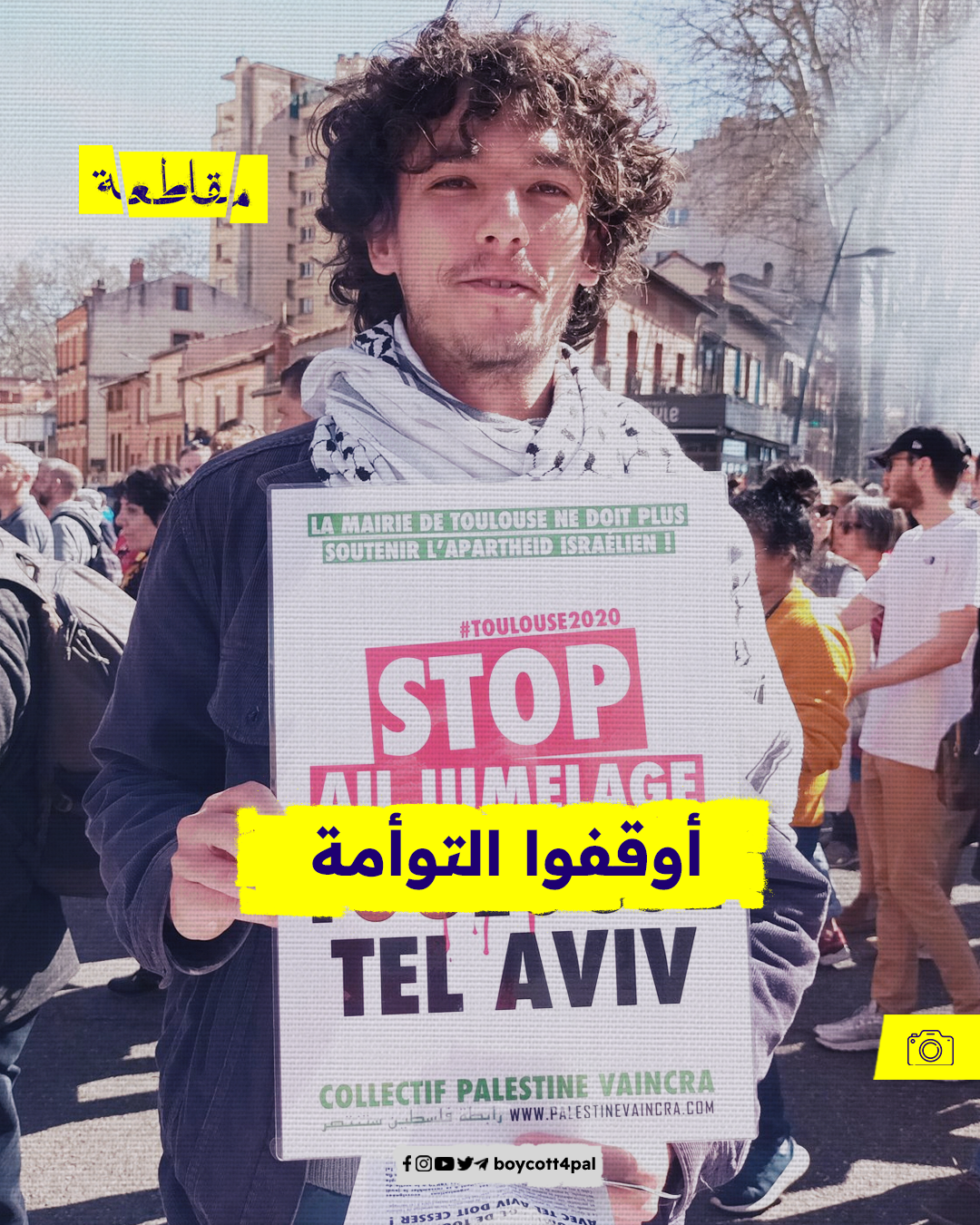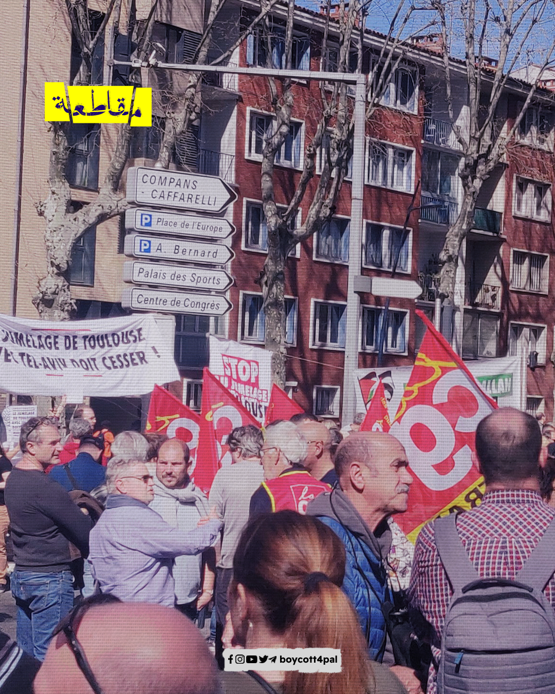 نظم نشطاء رابطة فلسطين ستنتصر وقفة احتجاجية في مدينة تولوز، للمطالبة بإلغاء التوأمة بين المدينة ومدينة "تل أبيب" الإسرائيلية، في ظل ارتفاع مستويات العنف في الأراضي الفلسطينية المحتلة.