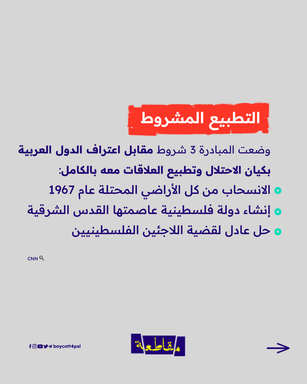 قدمتها السعودية في القمة العربية عام 2002، فرد عليها الاحتلال بعد ساعات باجتياح الضفة الغربية واحتلال مدنها، ووضعت شروطًا مقابل التطبيع، فهرولت الإمارات والبحرين والمغرب للتطبيع المجاني دون شرط مع "إسرائيل".