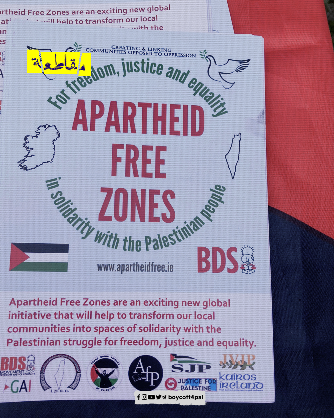 نظم عدد من نشطاء حملة التضامن الأيرلندي الفلسطيني طاولة معلومات في مدينة "كيلدير" الأيرلندية، للتعريف بانتهاكات الاحتلال وممارساته القمعية في الأراضي المحتلة، ضمن فعالية مناهضة الفصل العنصري الإسرائيلي.