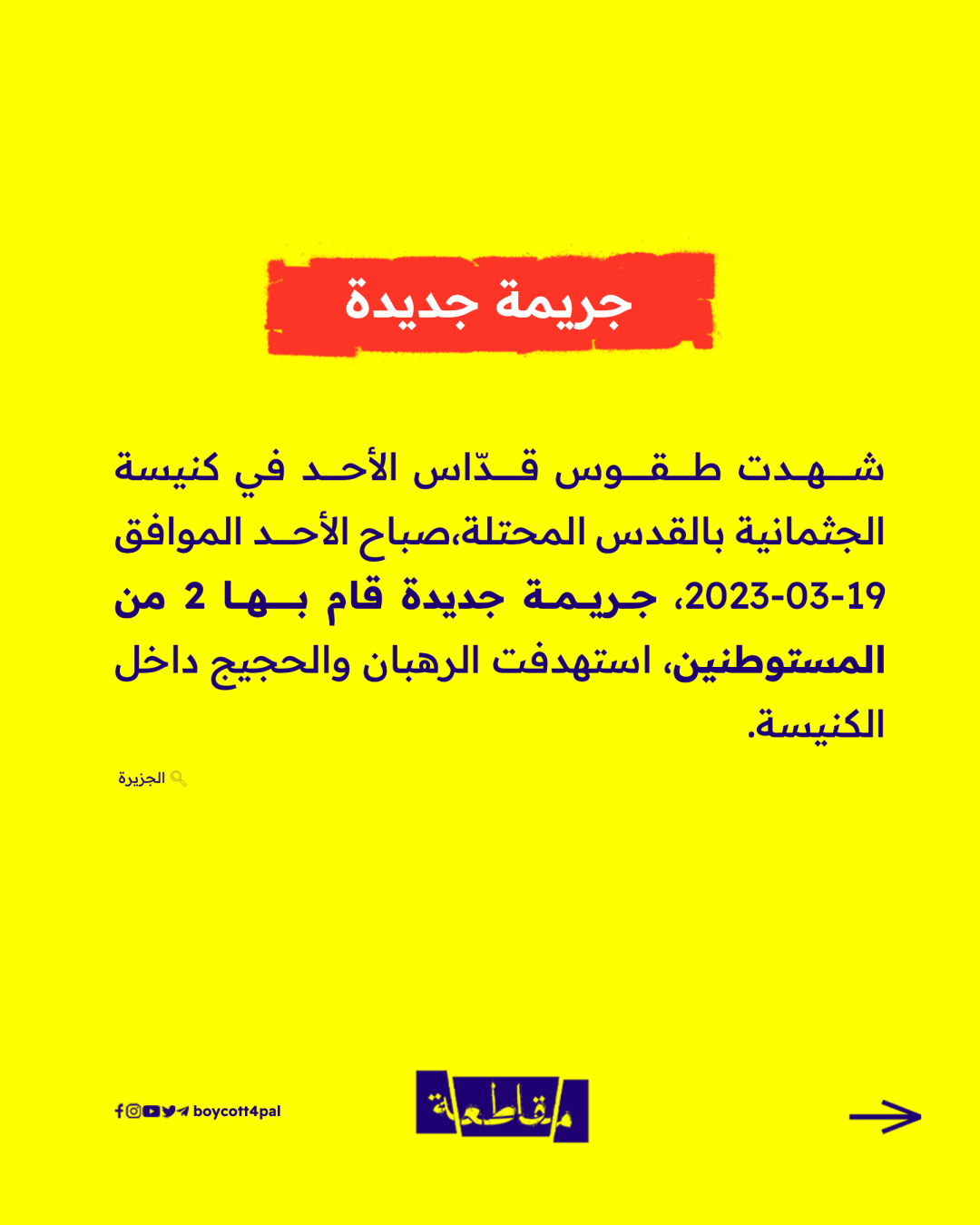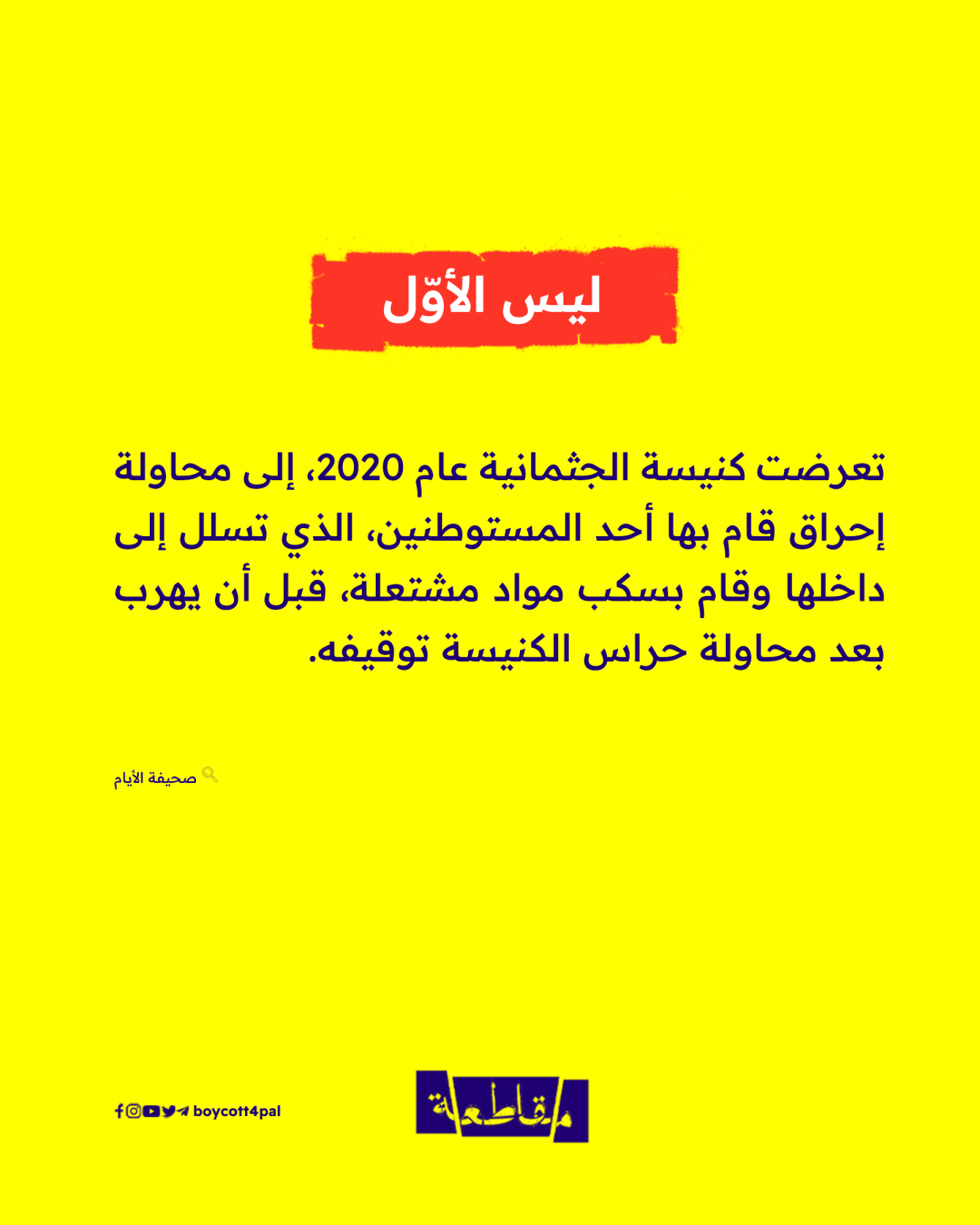 لم يكن الاعتداء الذي تعرضت له كنيسة الجثمانية يوم الأحد الماضي، هو الأول على يد المستوطنين، لكنه كان الأكثر إجرامًا باستهداف الرهبان والحجيج جسديًا خلال أدائهم مراسم قدّاس الأحد، وكاد أن يتسبب بوقوع ضحايا لولا تدخل أحد جيران الكنيسة والقبض على المجرمين.