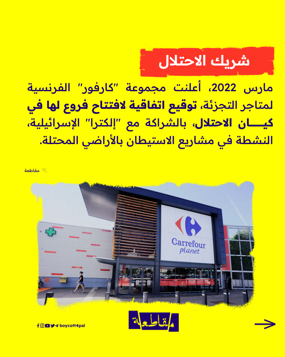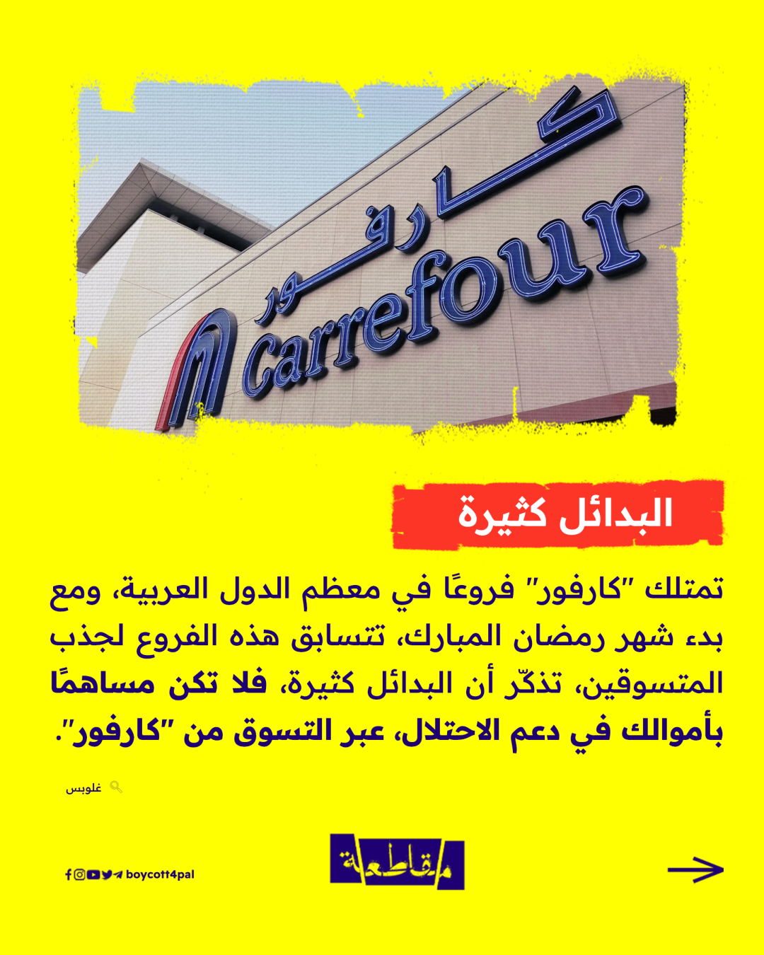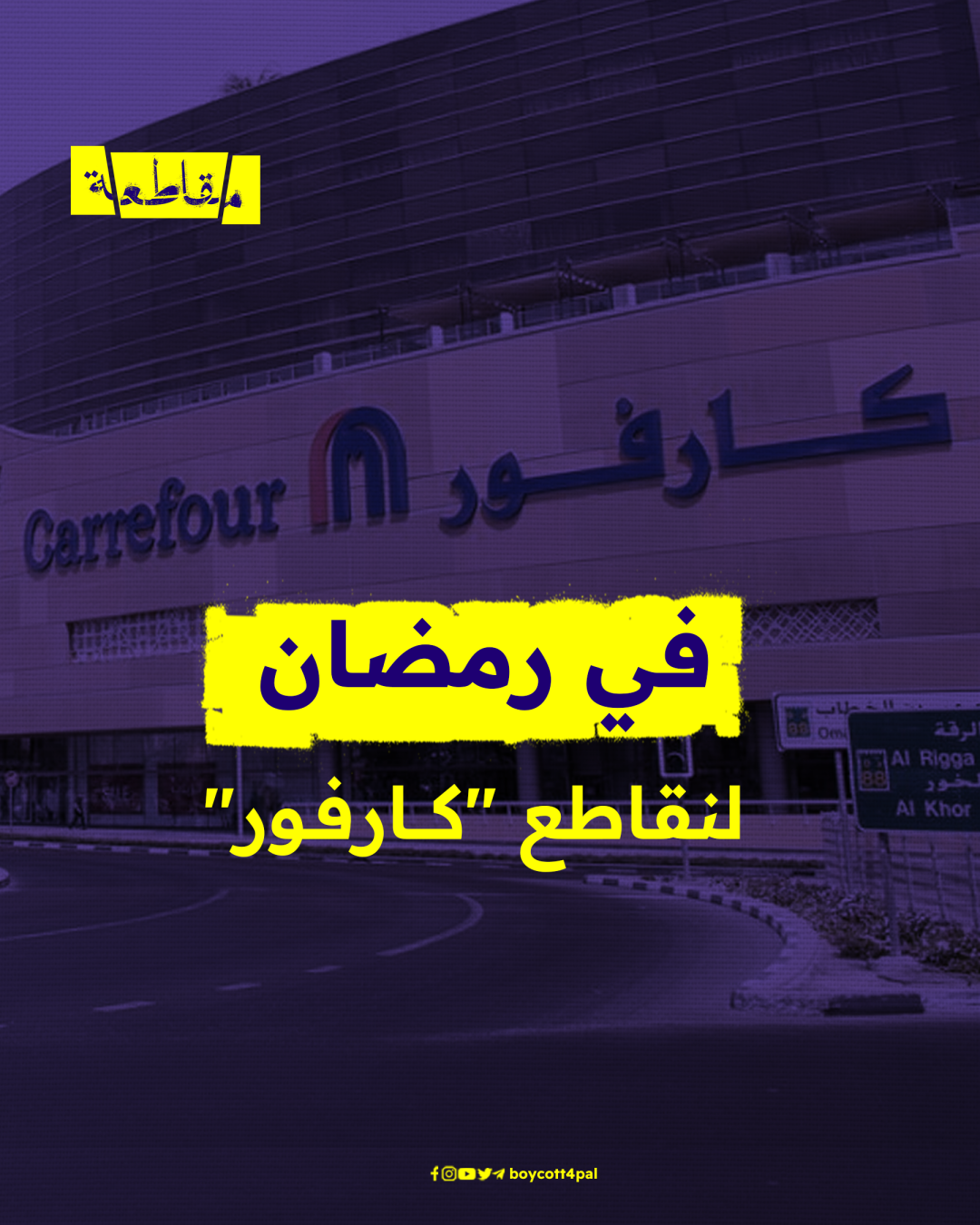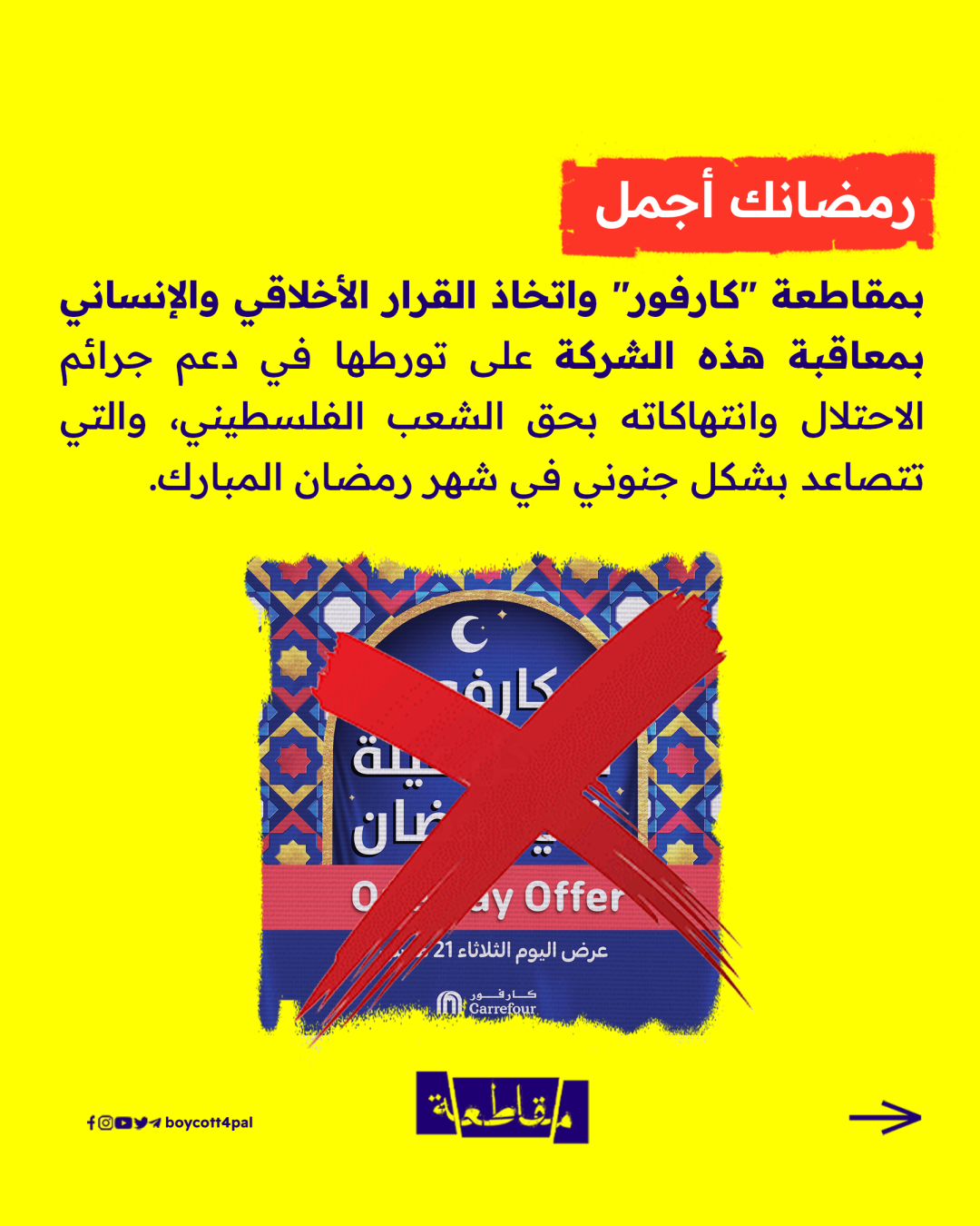 وأنتم تستعدون لتسوق حاجيات #رمضان، تذكروا أن متاجر #كارفور شريكة ومتواطئة في دعم جرائم وانتهاكات الاحتلال الإسرائيلي بحق الشعب الفلسطيني، بإصرارها على افتتاح فروع لها في أرضنا المحتلة، وتجاهلها لكل الأصوات التي تطالبها بالتراجع.