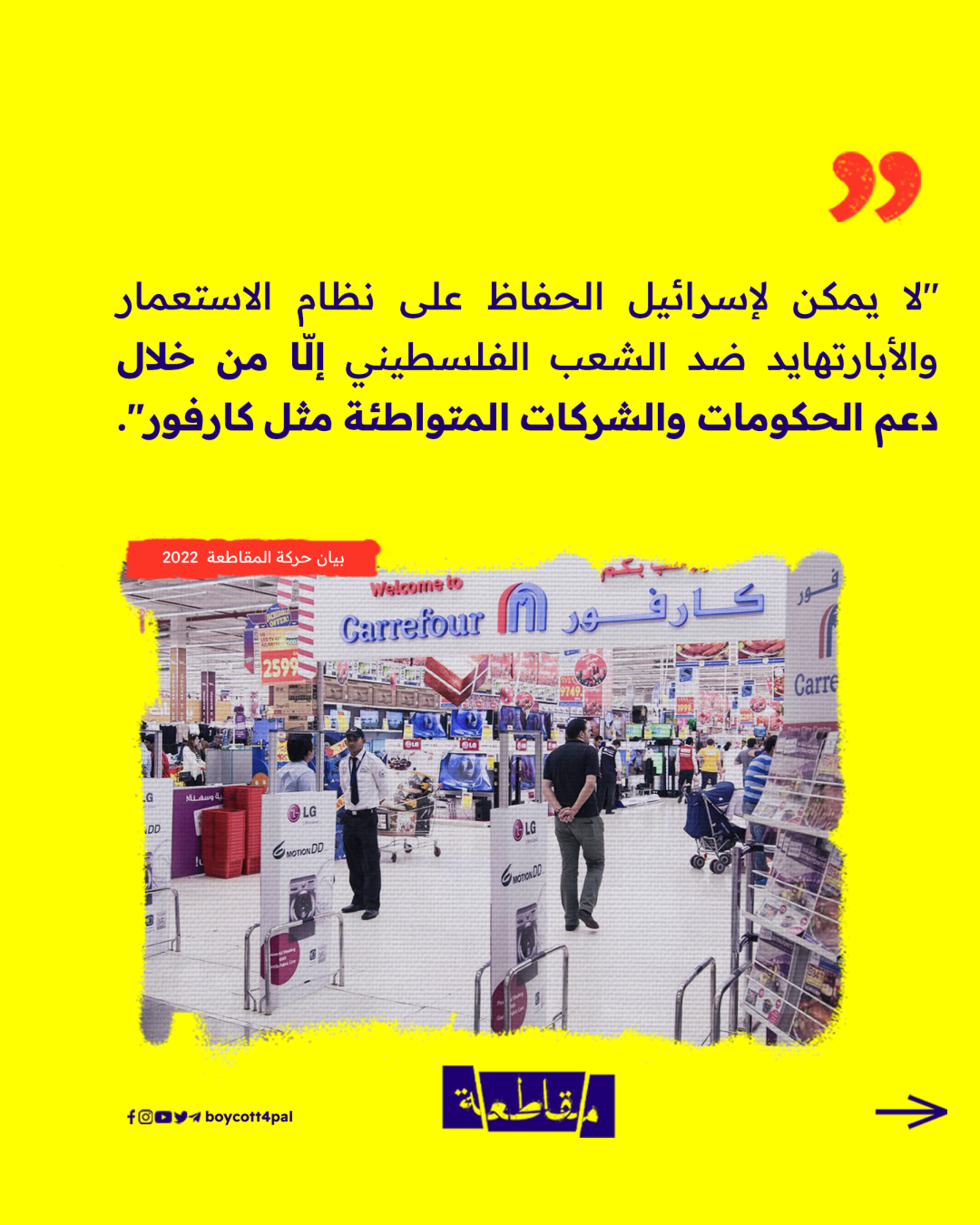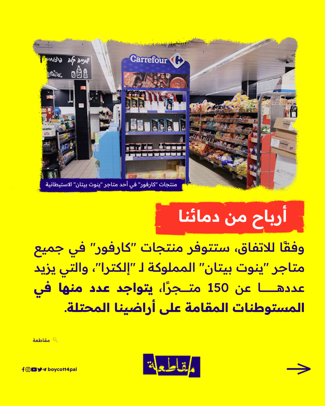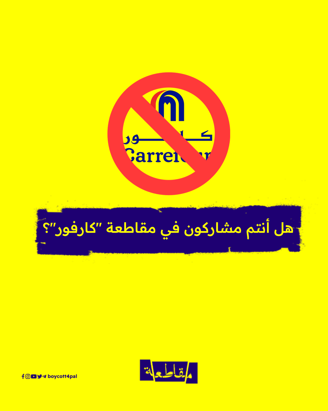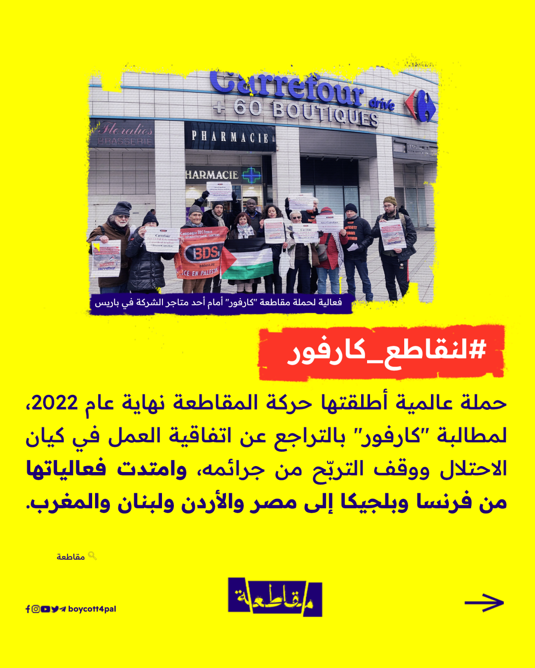 وأنتم تستعدون لتسوق حاجيات #رمضان، تذكروا أن متاجر #كارفور شريكة ومتواطئة في دعم جرائم وانتهاكات الاحتلال الإسرائيلي بحق الشعب الفلسطيني، بإصرارها على افتتاح فروع لها في أرضنا المحتلة، وتجاهلها لكل الأصوات التي تطالبها بالتراجع.