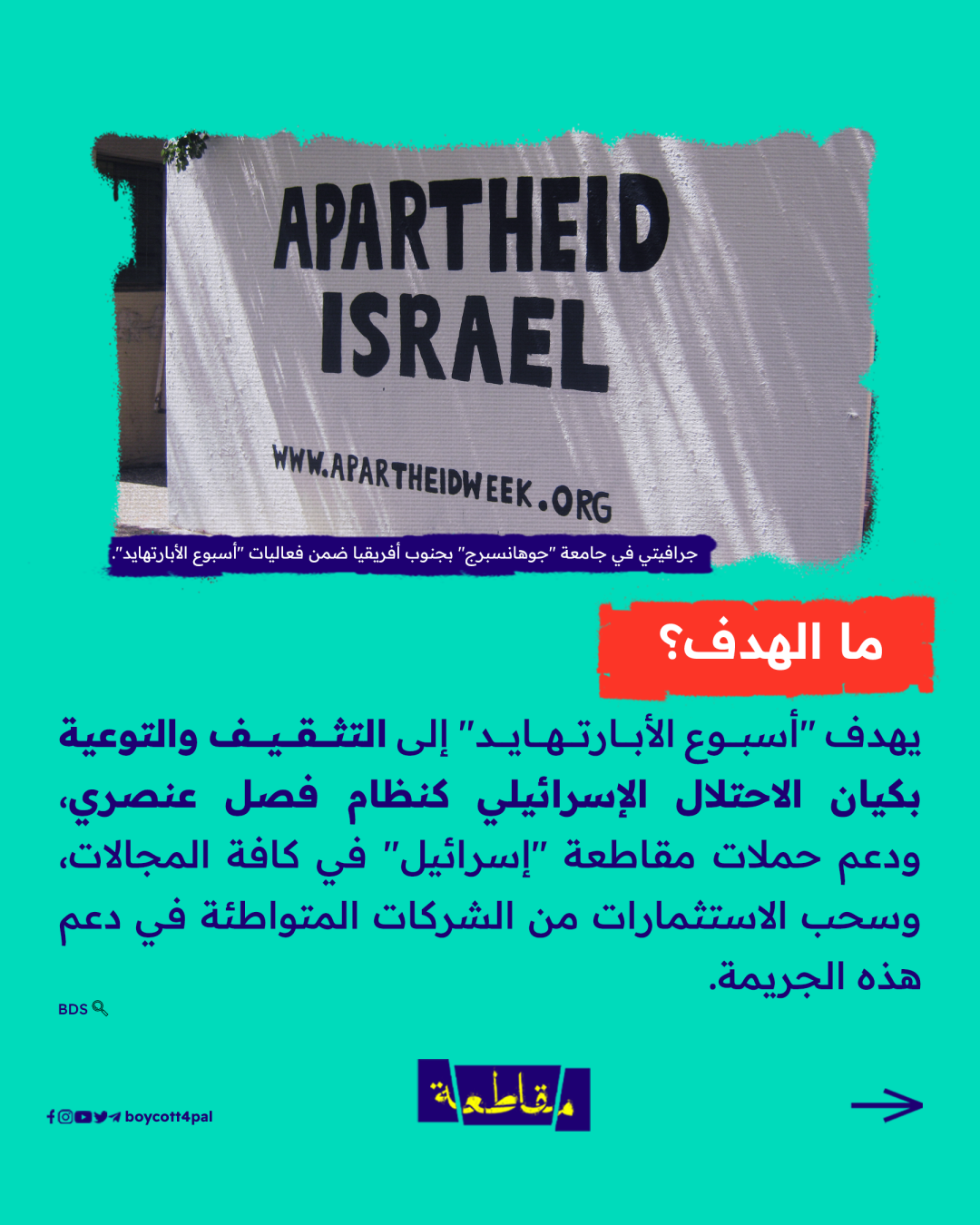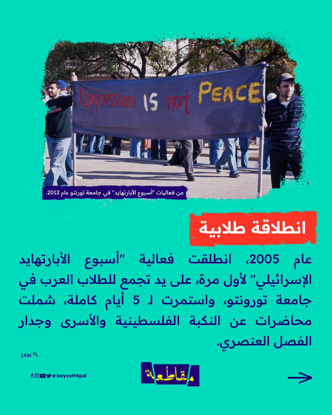 أطلقه الطلاب العرب في جامعة تورنتو عام 2005 كفعالية تضامن مع فلسطين،، وامتد إلى مدن العالم وجامعاتها، ليصبح حدثًا سنويًا حاشدًا لفضح جرائم الاحتلال وانتهاكاته.