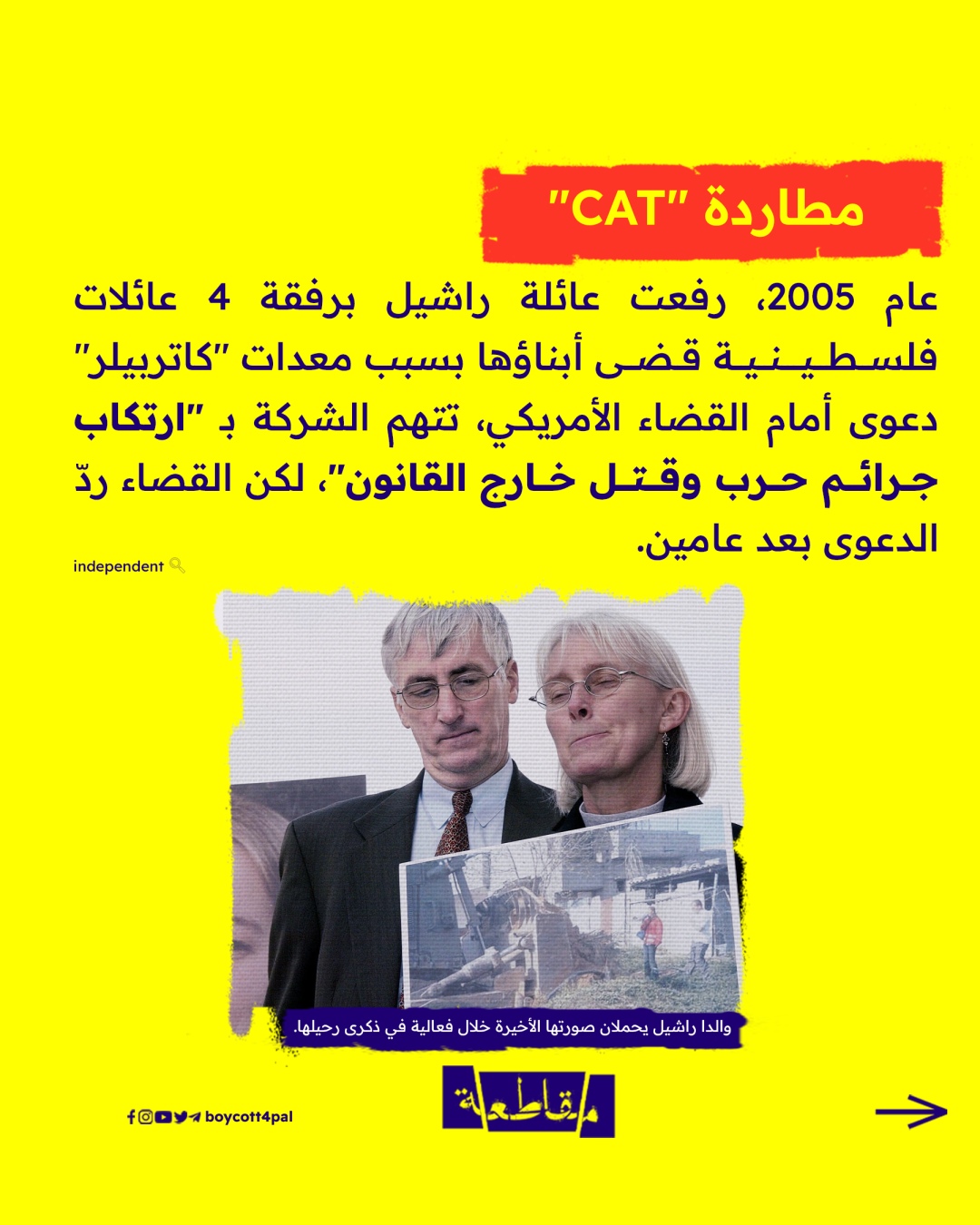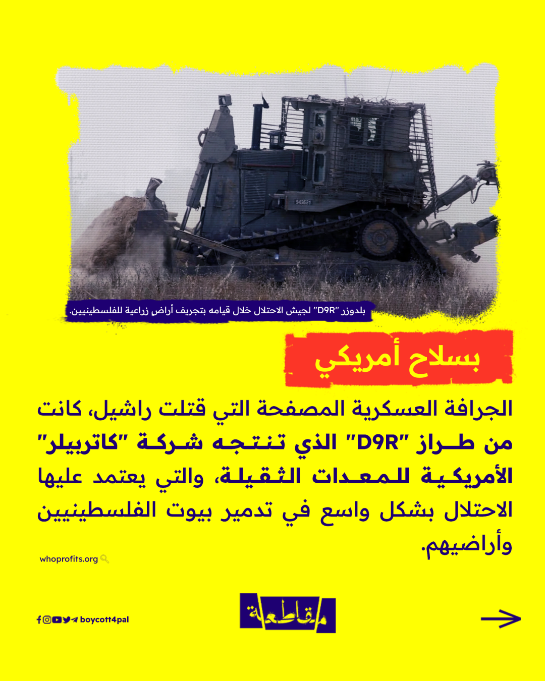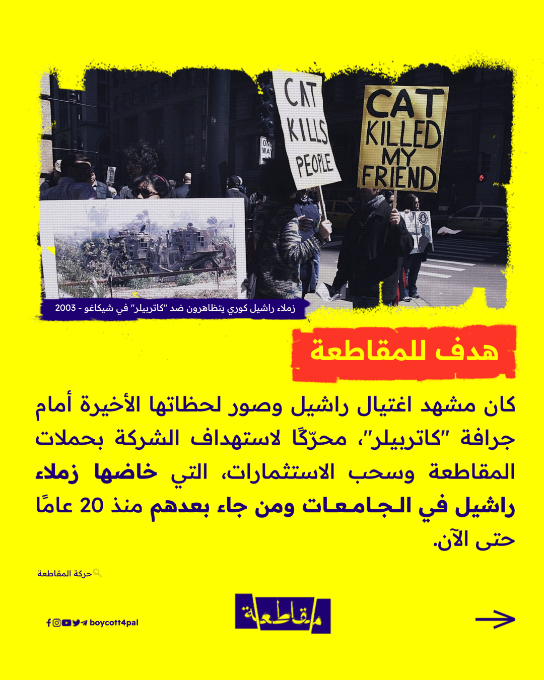 جريمة، كانت شرارة حملة مقاطعة "كاتربيلر" التي قادها زملاء راشيل، وتمددت لاحقًا إلى كبرى جامعات العالم، ملحقة خسائر اقتصادية بشريك الاحتلال، ومزوّده الأول بآليات الموت والخراب.