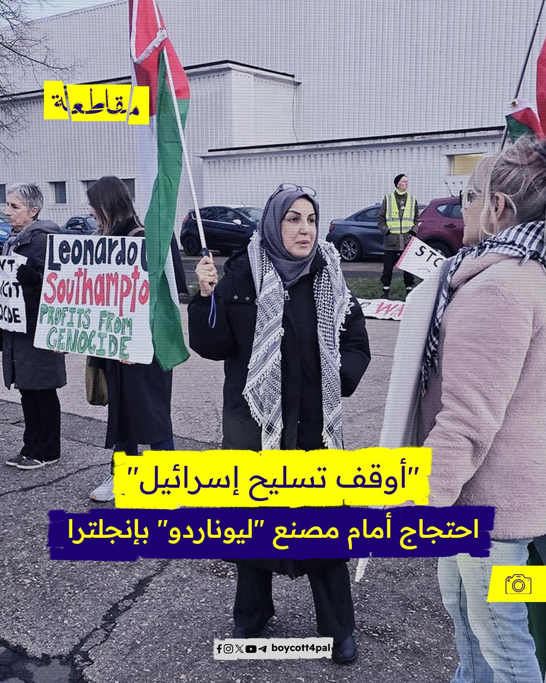 نظمت مجموعة مناصرة لفلسطين وقفة احتجاجية أمام مصنع "ليوناردو" في مقاطعة ساوثهامبتون بإنجلترا، احتجاجًا على استمرار المصنع في تزويد كيان الاحتلال بالأسلحة التي تساهم في قتل الفلسطينيين وسياسية الفصل العنصري. وحمل المحتجون لافتات مناهضة للاحتلال وللمصنع، كما رفعوا أعلام فلسطين ورددوا شعارات من قبيل "ليناردوا أوقف تسليح إسرائيل".