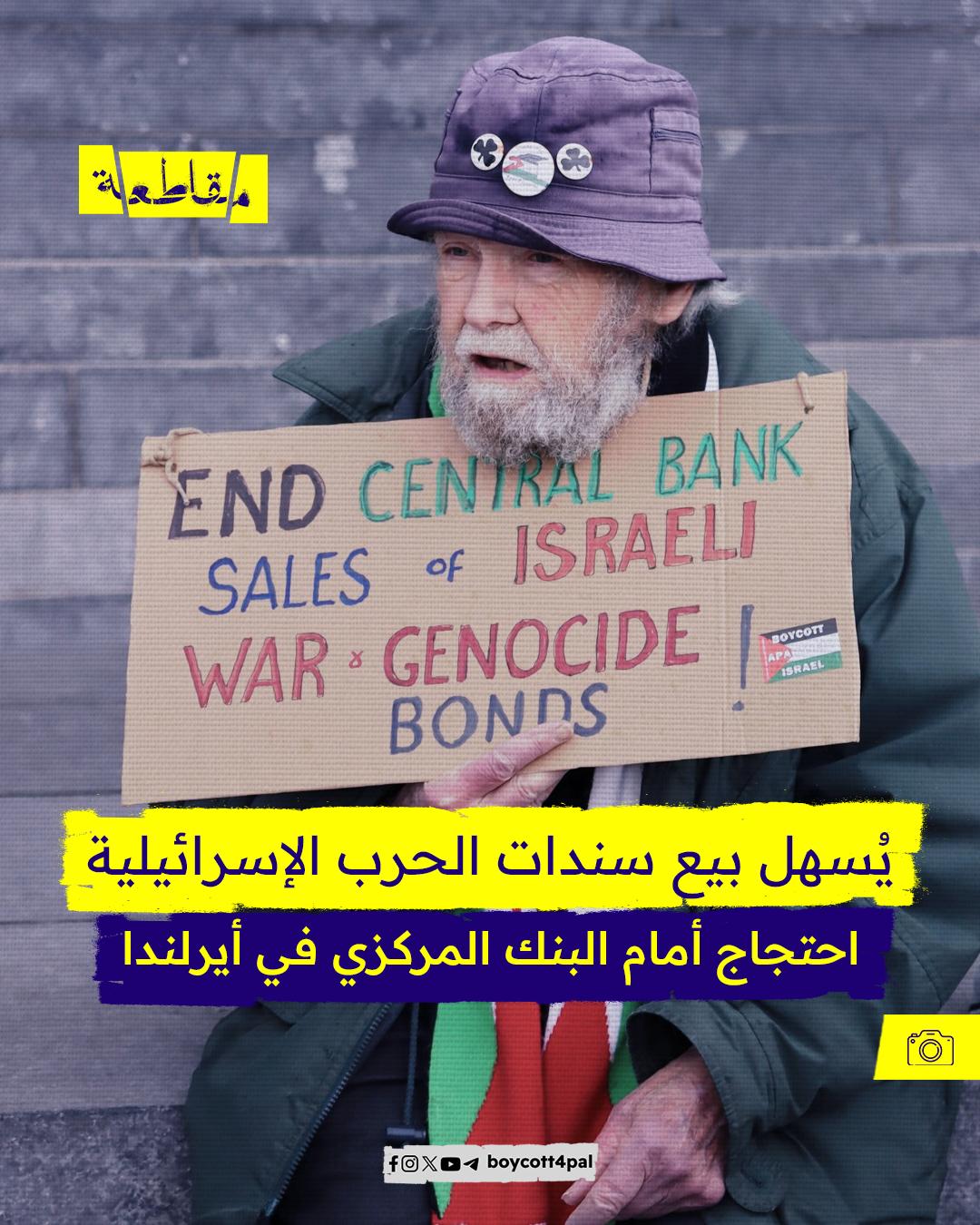 نظم مناصرون لفلسطين وقفة احتجاجية أمام البنك المركزي الأيرلندي احتجاجًا على تسهيل بيع سندات الحرب الإسرائيلية، ورفع المتظاهرون لافتات كُتب على بعضها "البنك المركزي: "أوقفوا تمويل الإبادة الجماعية"، ورفعوا أعلام فلسطين ورددوا شعارات مناهضة للاحتلال.