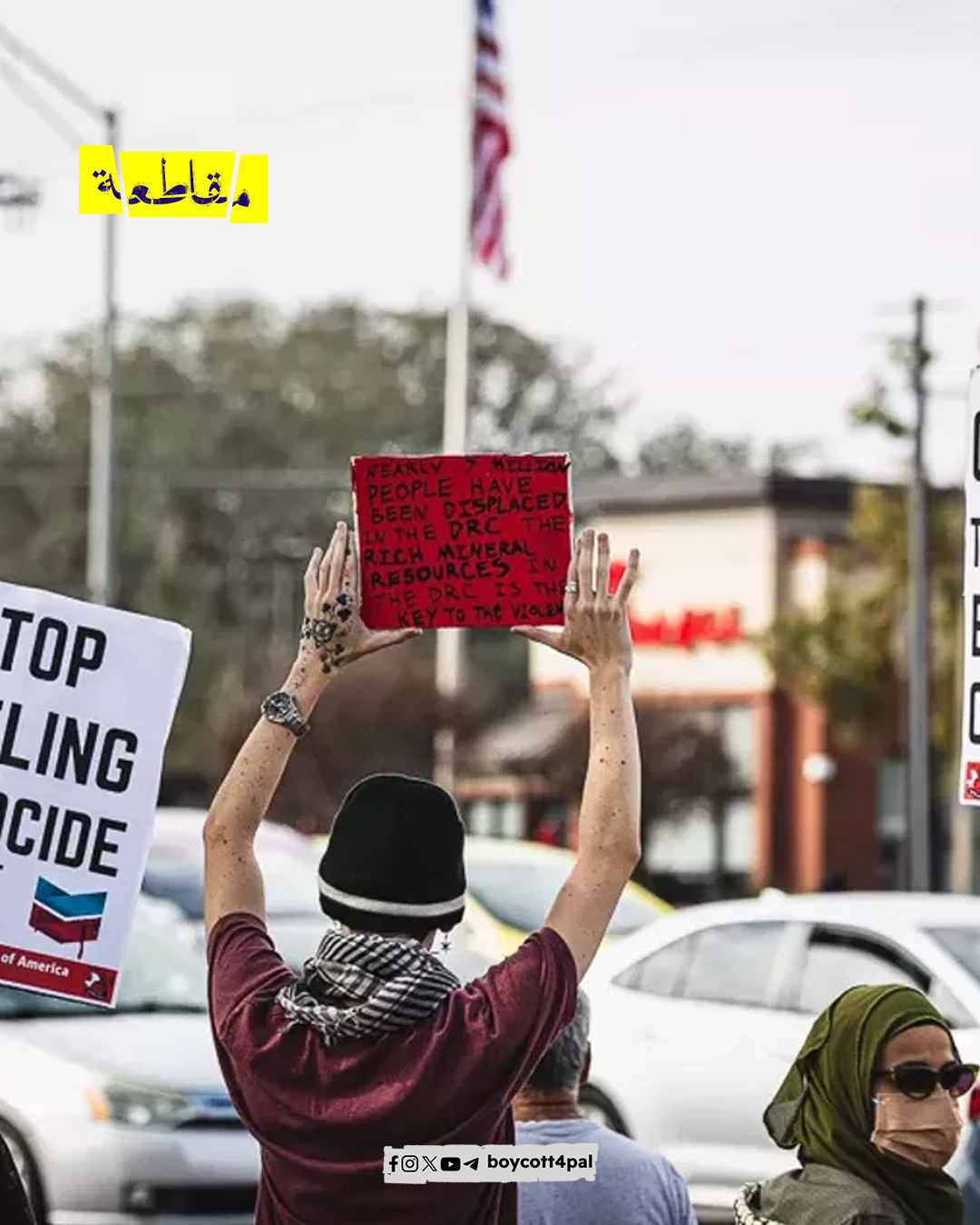 نظمت حركة المقاطعة احتجاجًا ضمن تحرك وطني بين 31 يناير والثاني من فبراير خارج محطة شيفرون في شارع "إي فاولر" قرب جامعة جنوب فلوريدا، مطالبة بمقاطعة الشركة بسبب دورها في توفير الطاقة والتمويل للحكومة الإسرائيلية، التي تستخدم هذه الموارد في شن الهجمات المستمرة على قطاع غزة.