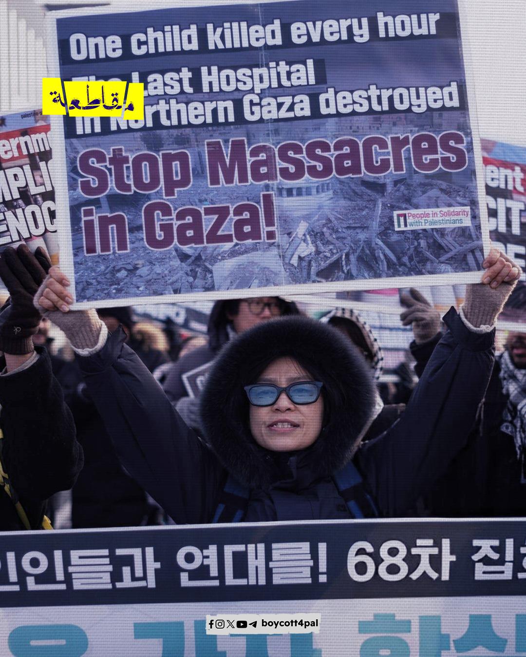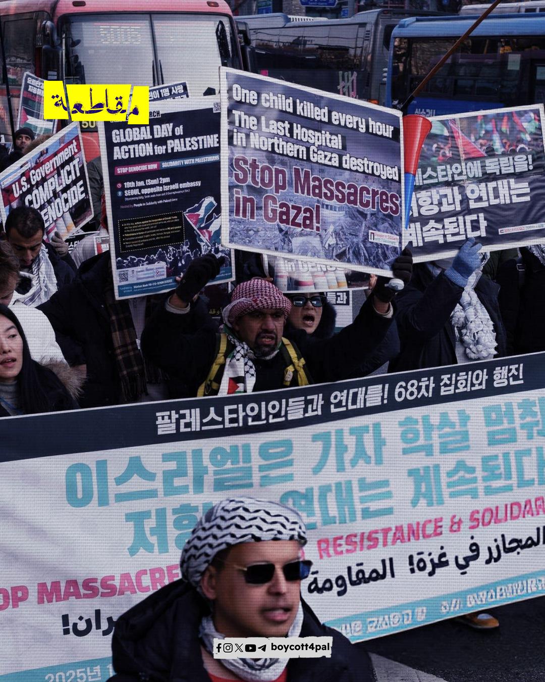 تجمع حوالي 100 عضو من حركة التضامن مع فلسطين وسط مدينة سيول في كوريا الجنوبية، بمظاهرة احتجاجية، تطالب بإنهاء الحرب الإسرائيلية، وإدانة الهجمات الصهيونية على قطاع غزة، ورفع المتظاهرون لافتات مناهضة للاحتلال والأعلام الفلسطينية.